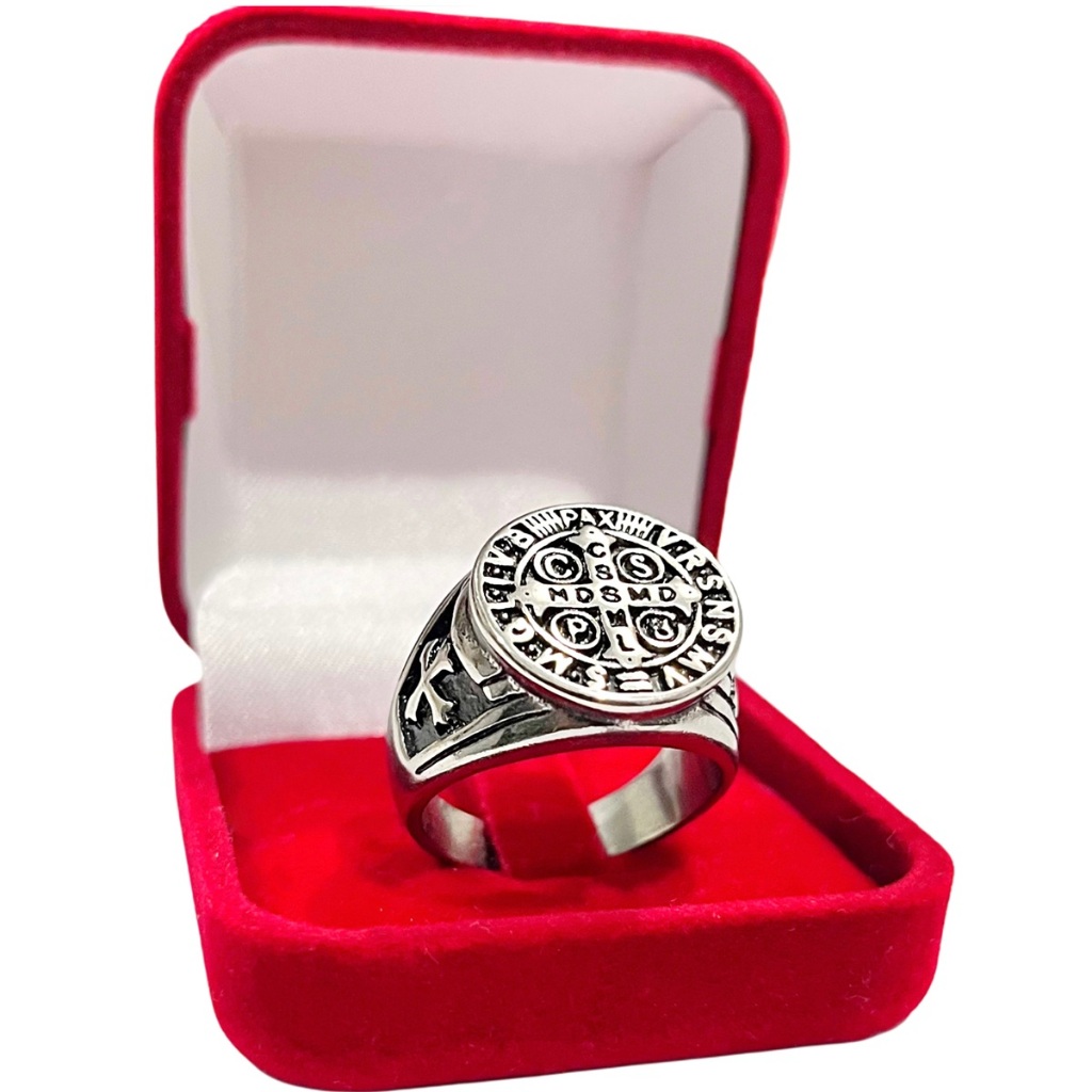 Anel São Bento Cruz Sagrada Aço 316l Maciço +Caixinha Anel
