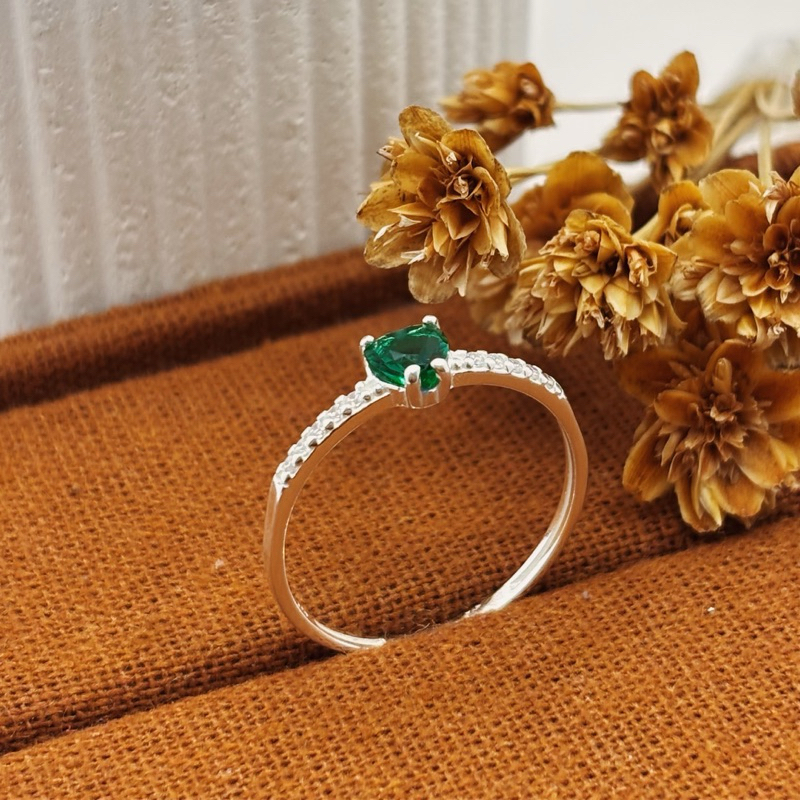 Anel Solitário Coração Cravejado Verde Em Prata 925