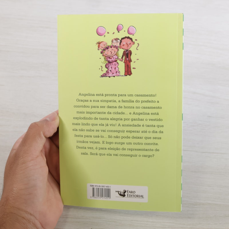 Livro Angelina Purpurina a Dama de Honra Angelina está empolgada para um casamento! Graças à sua simpatia, ela foi convidada pela família do prefeito para ser dama de honra no evento mais importante da cidade, e está radiante com o vestido deslumbrante que ganhou! A ansiedade é tanta que ela mal consegue esperar até o grande dia para usá-lo, mas precisa tomar cuidado para que seus irmãos não descubram. Para complicar ainda mais as coisas, Angelina recebe um novo convite: a eleição para representante de sala. Será que ela conseguirá conquistar o cargo? Nesta nova aventura, Angelina nos mostra sua energia contagiante e determinação, enquanto navega por vestidos deslumbrantes e desafios inesperados!