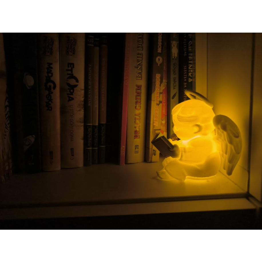 Anjo Leitor trazendo vibrações aconchegantes para qualquer canto O anjo funciona com vela led. O anjo pode sentar de duas maneiras diferentes. Se a luz for colocada totalmente dentro, o anjo pode sentar na borda de uma prateleira com as pernas penduradas. Segundo modo: Se você puxar a luz um pouco para fora, ela funciona como uma base que permite que o anjo sente em uma superfície plana.