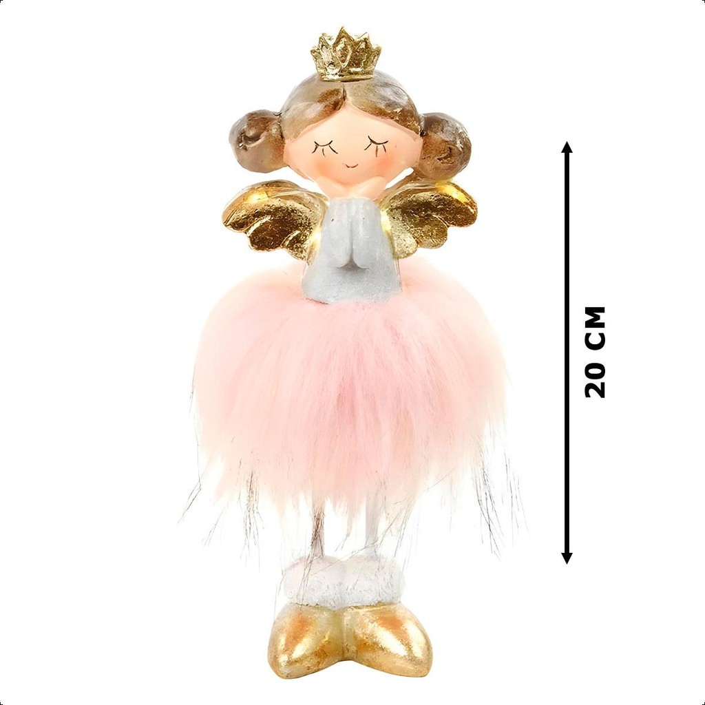 Anjo Decorativo Branco e Rosa Com Coroa e Asas Douradas com Led Mãos