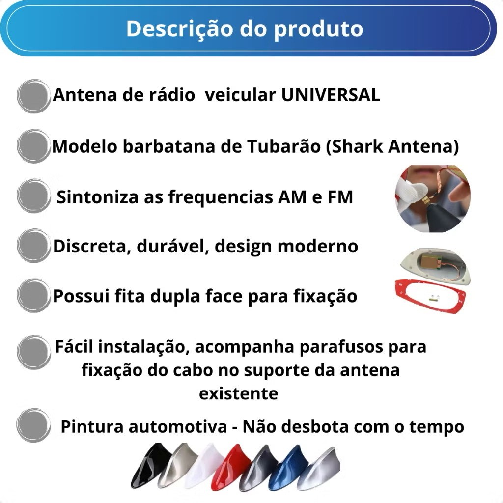 Antena Shark para Rádio Sinal FM (OBS: COMPROU E NÃO SERVIU, ABRA A DEVOLUÇÃO PELO MOTIVO MUDEI DE IDEIA) Sobre a diferença entre 1.5, 3.0 e 6,0 dB, é a frequência captada pela antena. Se for utilizar em uma área com sinal fraco, uma antena com ganho de 6,0 e 3,0 dB pode ser mais benéfica. A Antena automotiva com Haste de Tubarão é um produto excelente e de qualidade com um acabamento impecável. Além de possui um desing super moderno e esportivo, ela também capta sinais AM/FM. Muito fácil de instalar, ela possui uma cola dupla face na parte de baixo para melhor fixação, para evitar que não cole corretamente recomendamos que limpe primeiramente o local que será posicionada. Comprimento: 17,0 x 7,0 x 6,8 cm ( C x A x L ) Peso: 53g Especificações técnicas: - Modo de fixação: Fita dupla face específica para carro - Captação: AM/FM - Impedância elétrica: 50 - Cor: Preto/ Branco/ Cinza/ Prata/Vermelho/ Azul/ Dourado Composição: - Plástico rígidos e componentes eletrônicos Itens inclusos: 1 Antena automotiva (Shark)