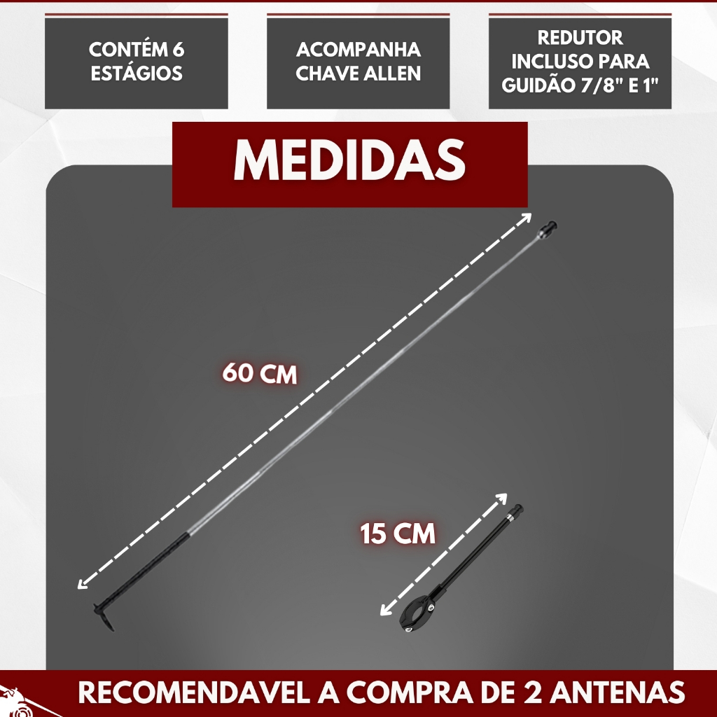ANTENA CORTA LINHA PIPA PARA GUIDÃO. CÓDIGO: ANTENAPIPA. APLICAÇÃO: MODELO UNIVERSAL ESPECIFICAÇÃO TÉCNICA: • Possui 6 estágios • Desarmada: 15 cm de comprimento • Armada: 60 cm de comprimento • Ponteira que corta a linha • Antena retrátil • Facil instalação • Lamina em aço inoxidável: corta a linha evitando que a mesma escape. • Tubos em alumínio: permite uma fácil retração dos estágios, evitando que emperre. !!!!!!!!!!!!!!! PONTEIRA DA ANTENA DE ALUMÍNIO !!!!!!!!!!!!!!! !!!!!!!!!!!!!!! USE DUAS ANTENAS PARA MAIS SEGURANÇA !!!!!!!!!!!!!!! CONTEÚDO EMBALAGEM: • 1x Antena Corta Pipa • 1x Parafuso Alen (ferramenta de ajuste) • Anel redutor para guidão 7/8" e 1" polegada (Para uso em guidão 7/8" é necessário retirar o anel redutor da base da antena) !!!!!!!!!!!!!!! FOTOS MERAMENTE ILUSTRATIVAS !!!!!!!!!!!!!!! SOBRE NOSSA EMPRESA: Somos uma organização com anos de experiência no mercado. Seja você um apaixonado por velocidade, um aventureiro de estrada ou um entusiasta da personalização, cumprimos a missão de fornecer peças e acessórios da mais alta qualidade para elevar sua experiência de pilotagem a um novo patamar. UTILIZE O CAMPO DE PERGUNTAS PARA TIRAR SUAS DÚVIDAS, e apenas confirme a compra em caso de CERTEZA de compatibilidade do produto! CÓDIGO VARIAÇÕES: - Preto: COD_774; - Cromado: COD_19970.
