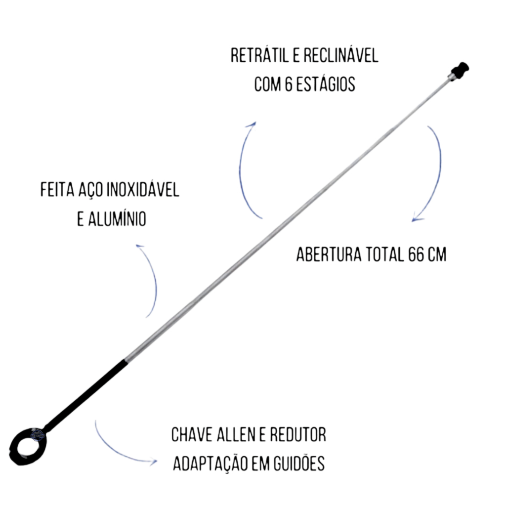 Antena Metalica Corta Pipa Retrovisor Guidão - Compr. 65CM Com designer moderno e seguro, a ANTENA CORTA PIPAS P/ GUIDÃO feita em aço inoxidável corta a qualquer linha, evitando que a mesma escape e cause acidentes. Além de permitir uma fácil retração dos estágios, o produto é resistente e permite maior segurança. Devido sua eficácia, tornou obrigatório para moto fretistas em todo território nacional. Não hesite em se proteger!! Características: - Fabricado em Aço; - Possui 65 centímetros de altura; - Possui 7 estágios de regulagem; - Indicado para instalar no guidão da moto de 22mm (7/8) de espessura, próxima a manopla; Embalagem contém: - 1 Antena corta-pipa - 1 Braçadeira - 2 Parafusos - 1 Chave allen