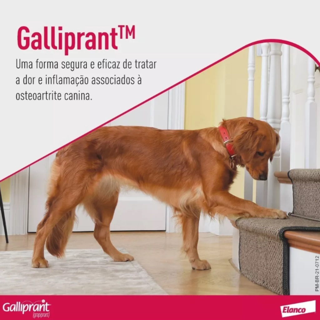 A MANADA ANIMAL é um e-commerce de produtos veterinários. É a escolha certa para tutores que prezam pela qualidade dos produtos que seu animal necessita. Tudo com o suporte de uma equipe de veterinários e gestores com mais de 10 anos de experiência no mercado. Fique tranquilo, todos os nossos produtos são originais, adquiridos através de distribuidores credenciados! Ah, e todas as vendas acompanham nota fiscal! MANADA ANIMAL, Tranquilidade pra você, cuidado para ele! __________________________________________ Indicação: GalliprantTM é indicado no tratamento da dor e inflamação associados a osteoartrite em cães. Administração: GalliprantTMdeve ser administrado por via oral, com ou sem alimento uma vez ao dia, na dose recomendada de 2 mg/kg de peso corporal(equivalente a uma faixa de dosagem de 1,5 - 2,9 mg/kg de peso corporal). Não há período máximo de duração do tratamento. Para tratamentos de longa duração, é recomendado monitoramento apropriado. Modo de ação: Galliprant™ apresenta um novo e exclusivo modo de ação, é antagonista seletivo do receptor EP4, da classe dos piprants. O receptor EP4 é o responsável primário por mediar a dor e a inflamação associadas à osteoartrite canina. Galliprant™ não é um inibidor das cicloxigenases (COX) e assim, não afeta a produção dos prostanoides (prostaglandinas) e não interfere nos mecanismos homeostáticos mediados por outros receptores. As vias dos prostanoides são importantes para a manutenção do equilíbrio funcional no sistema gastrointestinal, rins e fígado. Galliprant™ foi desenvolvido para levar bem-estar para cães portadores de osteoartrite de uma forma segura. Sua prescrição é recomendada para curto, médio e longo prazo, sem riscos para a saúde do animal, com perfil de segurança exclusivo na manutenção das funções gastrointestinais, renais e hepáticas. Composição: Cada 100 mg contém: Grapiprant 8 mg Excipiente q.s.p 100 mg Benefícios: Galliprant™ pode ser usado desde os estágios iniciais da OA canina Qualquer que seja a sua causa, a OA é autoperpetuante — alternando entre alteração da estrutura articular, degeneração da cartilagem, dor, diminuição da flexibilidade articular e redução da amplitude de movimento. Uma vez que a progressão da doença não pode ser completamente interrompida, é importante minimizar os fatores determinantes o mais rápido possível. Galliprant™ ajuda no controle da dor associada à OA, o que permite que os cães a atinjam níveis adequados de exercício.1,2 Isto, por sua vez, melhorar a força e a postura, facilitando a perda de peso. Peso corporal (kg) GALLIPRANT 60 mg 20,5kg – 34 kg - 01 Comp.