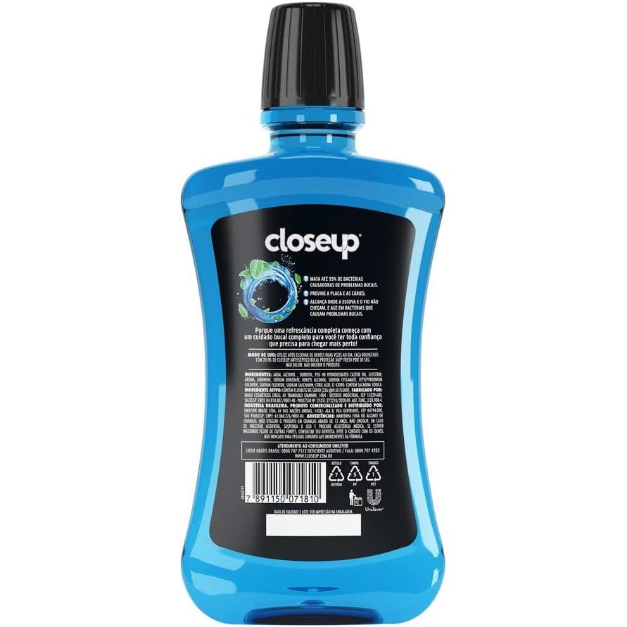 Anti-Séptico Close Up Ice Com Álcool 500ml Principais Características: - Fórmula com álcool: O Anti-Séptico Close Up Ice contém álcool, proporcionando uma ação eficaz contra as bactérias causadoras de mau hálito, garantindo uma boca mais saudável e protegida. - Sensação de frescor intensa: Sua fórmula oferece um frescor gelado que dura por horas, proporcionando uma sensação de limpeza e refrescância prolongada. - Praticidade no uso: Com embalagem de 500ml, é ideal para uso diário, garantindo durabilidade e um ótimo custo-benefício. Benefícios: - Elimina as bactérias causadoras de mau hálito e placa bacteriana, contribuindo para a saúde bucal. - Proporciona uma sensação de frescor duradouro, mantendo a boca limpa por mais tempo. - Auxilia na prevenção de cáries e gengivite, promovendo uma higiene bucal completa. - Não contém flúor, sendo uma opção adicional para a sua rotina de cuidados. Diferenciais do Produto: - Refrescância prolongada: A sensação de frescor gelado proporcionada pelo Close Up Ice é única, deixando a boca com um hálito mais agradável por mais tempo. - Com álcool: A presença do álcool em sua fórmula garante ação antimicrobiana eficaz para combater as bactérias de forma rápida e eficiente. - Embalagem econômica: A embalagem de 500ml oferece mais quantidade de produto, ideal para uso contínuo e por toda a família. Especificações Técnicas: - Peso: 500ml - Marca: Close Up Instruções de Uso: - Agite bem antes de usar. - Após escovar os dentes, coloque uma pequena quantidade de anti-séptico na tampa e faça bochechos por 30 segundos. - Não engula o produto e evite o contato com os olhos. - Pode ser usado até duas vezes ao dia para garantir uma higiene bucal completa. Avisos e Precauções: - Manter fora do alcance de crianças. - Em caso de ingestão acidental, procure orientação médica. - Evite contato com os olhos. - Em caso de irritação ou desconforto, suspenda o uso e consulte um médico. - Produto para uso oral externo. O que está incluso? - 01 Anti-Séptico Close Up Ice Com Álcool 500ml ---- DÚVIDAS FREQUENTES ---- Os produtos são originais? Sim. Todos os nossos produtos são originais. Emitem nota fiscal? Sim. Emitimos nota fiscal para todos os pedidos.