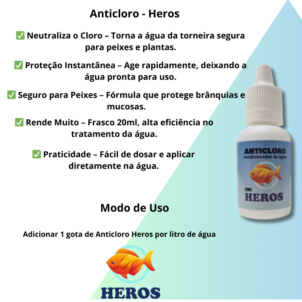 Anticloro Concentrado 20ml – Proteção Instantânea para Seus Peixes 🐟💧 Mantenha a saúde e o bem-estar dos seus peixes com o Anticloro 20ml Heros. Fórmula concentrada e de alto rendimento: apenas 1 gota trata 1 litro de água, neutralizando de forma imediata o cloro presente na água da torneira ou até mesmo em filtros. 👉 O cloro é extremamente prejudicial aos peixes, podendo causar estresse e até mortes. Com o anticloro, você garante um ambiente seguro, saudável e cristalino para seus peixes e plantas aquáticas. ✅ Ação imediata – neutraliza o cloro na hora. ✅ Super econômico – 1 gota = 1 litro de água. ✅ Versátil – indicado para aquários, lagos, caixas d’água e tanques. ✅ Segurança para seus peixes – protege contra intoxicação e estresse. 💡 Escolha o kit ideal para sua necessidade e garanta economia com mais proteção para seus peixes!