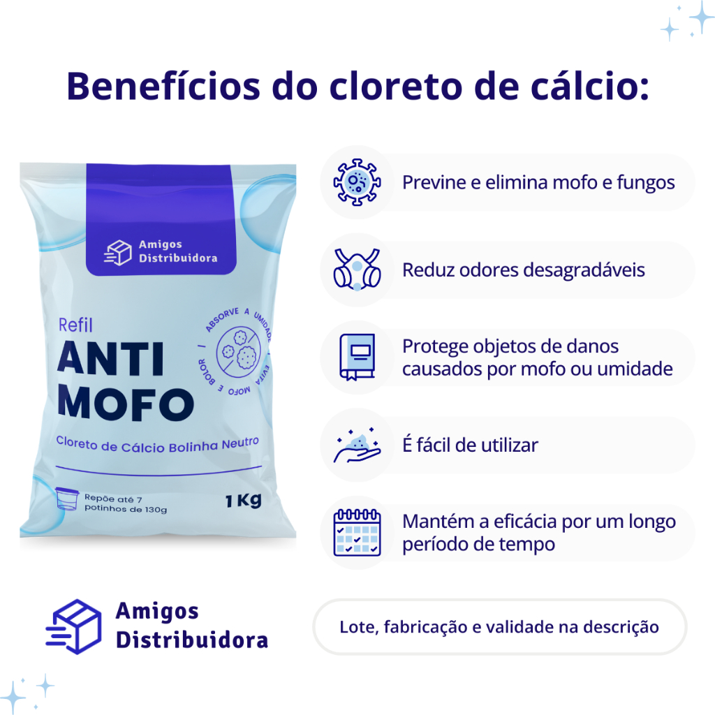 O Antimofo Amigos Distribuidora é usado para diminuir a umidade em ambientes fechados. Ele absorve a umidade do ar, reduzindo a umidade relativa do ambiente e, assim, ajuda a prevenir o crescimento de mofo e bolor. Principais aplicações Anti mofo Amigos Distribuidira O Anti mofo pode ajudar a resolver várias questões relacionadas à umidade e ao mofo em ambientes fechados. - Prevenção de Mofo: Ajuda a prevenir o crescimento de mofo e bolor em áreas úmidas. - Redução da Umidade: Absorve a umidade do ambiente, diminuindo a sensação de ambiente úmido. - Proteção de Roupas: Pode ser usado em armários e guarda-roupas para evitar o mofo em roupas e tecidos. - Melhoria da Qualidade do Ar: Contribui para melhorar a qualidade do ar ao reduzir o excesso de umidade. - Evita Danos em Livros e Documentos: Protege livros, documentos e papéis de danos causados por umidade. - Manutenção de Alimentos Secos: Pode ser usado para manter alimentos secos e evitar o acúmulo de umidade. - Conservação de Produtos Eletrônicos: Ajuda a proteger eletrônicos sensíveis à umidade, como câmeras e instrumentos musicais, contra danos. Características: Cor: Branco Aparência Pellets Pureza:75,30 NaCI:2,00 Magnésio total como MgCI2: 0,89 Ca(OH)2: 0,08 CaSO4: 0,02 Ph em sol. a 1%: 9,62 Insolúveis em água: 0,05
