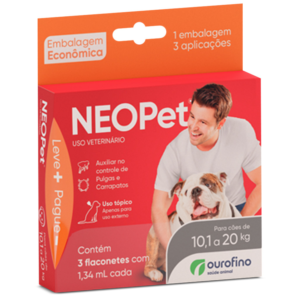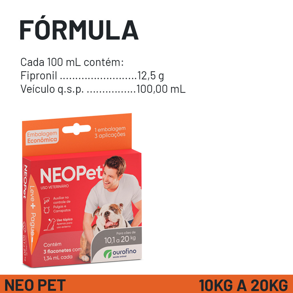 ____________________________________________________________________________ A nossa loja está a mais de 10 anos no mercado, com produtos originais e com nota fiscal. ____________________________________________________________________________ Proteja seu pet contra pulgas e carrapatos com o NEOPet, um antiparasitário tópico de alta eficácia! Formulado com Fipronil (12,5 g por 100 mL), NEOPet auxilia no controle das infestações por pulgas (Ctenocephalides felis felis) em cães e gatos e carrapatos (Rhipicephalus sanguineus) em cães. VANTAGENS: - Uso prático e seguro, com aplicação tópica. - Proteção prolongada, com média de ação de 30 dias. COMO USAR: NEOPet deve ser aplicado exclusivamente pela via tópica, conforme as recomendações abaixo: Certifique-se de que o volume do flaconete é compatível com o peso corporal do animal a ser tratado antes da aplicação no local indicado. 1-Observe se não há produto na saída do flaconete batendo na sua parte superior; 2-Dobre a parte superior do flaconete no local indicado; 3-Mantenha o animal em posição confortável para facilitar a aplicação. Afaste os pelos do animal com os dedos até que a pele esteja visível em cada ponto onde o produto será aplicado; 4-Em cães, aplique todo o conteúdo do flaconete diretamente sobre a pele, entre a região da nuca e as escápulas do animal, em vários pontos (conforme ilustração na bula), evitando que o produto escorra nos pelos pelas laterais do animal; O período médio de ação de neopet é de 30 dias. Em caso de alto desafio de infestação, a frequência da reaplicação poderá ser alterada a critério do médico-veterinário. Os animais podem apresentar discreta mancha oleosa e eventual formação de pó branco no local da aplicação do produto, tal alteração desaparece em até 48 horas após a aplicação. Com NEOPet, seu pet vive livre de parasitas e com mais conforto! ____________________________________________________________________________ Gostou? Não perca tempo, garanta já o seu!