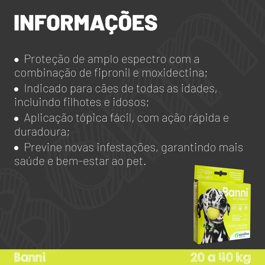 Atenção Validade - 03/2026 PROTEÇÃO REFORÇADA: O FIM DOS PARASITAS JÁ CHEGOU! Adquira o Antipulgas Ouro Fino Pet Banni, o endectocida Super Premium ideal para cães de porte grande, de 20,1 a 40 Kg. Conte com a credibilidade de 10 anos de mercado, com produtos originais e Nota Fiscal. O Banni é a solução 3 em 1 que seu pet precisa. Sua fórmula tópica exclusiva combina Fipronil e Moxidectina, oferecendo uma blindagem completa: ELIMINAÇÃO RÁPIDA: Extermina pulgas (Ctenocephalides felis felis) e carrapatos (Rhipicephalus sanguineus) com eficiência imediata. SAÚDE DIGESTIVA: Trata e previne os principais vermes intestinais (Ancylostoma spp., Toxocara spp., Trichuris vulpis). PRATICIDADE: Aplicação simples via pipeta única, garantindo proteção rápida e duradoura para cães de todas as idades. Não deixe que parasitas comprometam a vitalidade do seu amigo. Invista na proteção completa com Ouro Fino Pet Banni. Garanta já o bem-estar e a tranquilidade que seu cão de 20 a 40 kg merece!