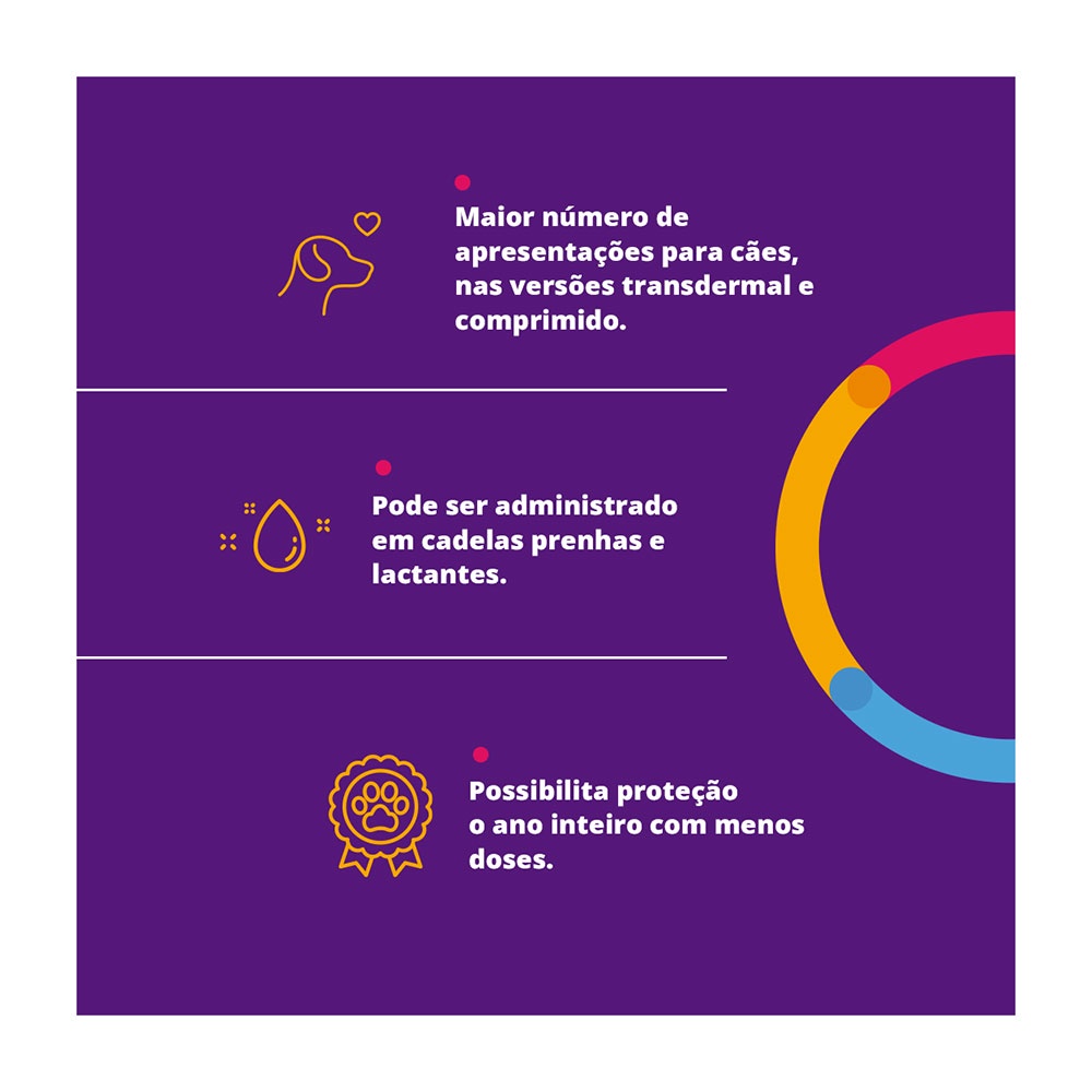 – Indicado para cães; – Elimina pulgas e carrapatos; – Proteção que dura por 12 semanas; – Não perde o efeito com o banho; – Via oral, realiza uma administração limpa e fácil; – Pode ser utilizado cadelas gestantes ou lactantes; – Contém 1 comprimido mastigável de 1000mg de Fluralaner. Bravecto é indicado para o tratamento de infestações por carrapatos e pulgas em cães, proporcionando 12 semanas de proteção. Bravecto é um inseticida e acaricida, sistêmico com longa duração de ação, que promove eficácia imediata e persistente por 12 semanas contra carrapatos e pulgas. Os carrapatos e pulgas devem estar aderidos ao cão, e já tendo iniciada a alimentação para serem expostos ao princípio ativo. Antipulgas Bravecto elimina carrapatos e pulgas em 12 e 8 horas. respectivamente. Além disso, controla eficazmente as populações de pulgas no ambiente, nas áreas às quais o cão tem acesso. Bravecto pode ser utilizado como parte de uma estratégia de tratamento para a dermatite alérgica à picada de pulgas. Pulgas Eficácia imediata: Acaba com até 99% das pulgas em 8 horas, antes da oviposição, impedindo novas reinfestações. Eficácia persistente: Mantém uma eficácia de 96-100% durante todo o período de atividade de tratamento. Carrapatos Eficácia imediata: Elimina 100% dos carrapatos em 12 horas. Eficácia persistente: Mantém uma eficácia de 96-100% durante todo o período de atividade de tratamento. BRAVECTO, começa a agir em menos de duas horas após a sua administração e elimina mais de 99% das pulgas (Ctenocephalides felis e Ctenocephalides canis) em até 8 horas e 100% dos carrapatos (Rhipicephalus sanguineus, Ixodes ricinus, Ixodes hexagonus, Ixodes scapularis, Ixodes holocyclus, Dermacentor reticulatus e Dermacentor variabilis) em até 12 horas, mantendo esse nível de eficácia durante as 12 semanas.