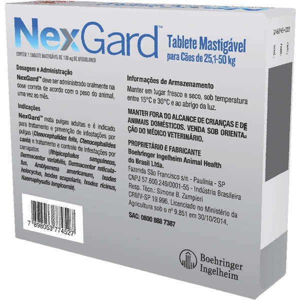 - Segurança e eficácia na medida; - Proteção mensal contra pulgas e carrapatos; - Pode ser administrado com ou sem alimentos; - Disponível em embalagens com um ou três tabletes; - Tablete mastigável sabor carne que os cães adoram; - Indicado para todos os cães a partir de 8 semanas de idade. Referência no tratamento contra pulgas e carrapatos, o Antipulgas e Carrapatos NexGard 136 mg para Cães de 25,1 a 50 Kg é comprovadamente seguro para cães de qualquer raça e conta com uma linha completa para atender diferentes portes e pesos. Pode ser administrado em cães adultos e filhotes a partir de oito semanas de vida e pesando acima de 2kg. Nexgard tem um rápido início de ação e atinge 100% de eficácia em 8 horas para pulgas. O NexGard funciona por 30 dias. Para manter seu pet livre de pulgas e carrapatos, faça o tratamento mensal. NexGard: a solução na medida contra pulgas e carrapatos. Modo de Uso: A administração de NexGard será uma tarefa fácil, pois o tablete mastigável sabor carne é altamente aceito pelos cães, graças a sua alta palatabilidade. Pode ser oferecido com ou sem alimentos, pois não altera sua eficácia. Para melhores resultados, garanta que o seu cão consuma o tablete por inteiro e observe por alguns minutos para se certificar de que nenhuma parte foi desperdiçada. Escolha número 1 entre os veterinários, no combate de pulgas e carrapatos pode ser administrada no seu cachorro com um tablete delicioso. NexGard é aprovado pelo FDA (Food and Drug Administration) o órgão governamental dos Estados Unidos responsável pelo controle dos alimentos e também pelo MAPA ( Ministério da Agricultura, Pecuária e Abastecimento), fazendo dele comprovadamente seguro para uso em cachorros e demonstrou 100% de eficácia. Para melhores resultados, garanta que o seu cachorro consuma o tablete por inteiro e o observe por alguns minutos para garantir que nenhuma parte seja desperdiçada. Caso o tablete não tenha sido consumido por inteiro ou se houver vômito dentro de 2 horas, de outro tablete para garantir sua eficácia. Perguntas frequentes: 1) Por que vejo uma maior quantidade de pulgas em meu cachorro após o uso de NexGard? A ação de NexGard na pulga causa hiperestimulação, desta forma elas sobem para as extremidades dos pelos enquanto morrem. 2) O banho atrapalha a eficiência de NexGard? Banhos ou qualquer atividade do cachorro na água não interfere na ação de NexGard. 3) Meu cachorro pode utilizar NexGard caso esteja utilizando outros medicamentos? Sim. Os medicamentos não impactaram a segurança ou a eficácia de NexGard. 4) Posso administrar NexGard com intervalo menor que 30 dias? Não é recomendada. 5) Quais são os efeitos adversos que podem decorrer do uso de NexGard? Vômito, pele seca ou descamativa, diarreia, letargia e falta de apetite. Deve-se utilizar com cautela em cachorros com histórico de convulsões. Especificações Indicação Cachorros Porte Gigante, Grande, Médio Idade Filhotes, Adultos Tipo de Antipulgas Oral Sabor Carne Frequência Recomendada (dias) 30 Composição Princípio Ativo Afoxolaner. Marca NexGard, Merial