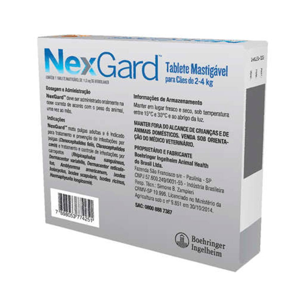 - Indicado para cães; - Para cães de 2 a 4kg; - Com o princípio ativo afoxolaner; - Em até 8 horas, elimina as pulgas em cães; - Controla infestações de pulgas por até 30 dias; - Comprimido mastigável no sabor de carne; - Contém 1 tablete. NexGard é a solução completa contra pulgas e carrapatos em cães. Facilite a proteção do seu cão contra parasitas internos e externos. Proteja seu cachorro com um saboroso tablete mastigável mensal de NexGard, o remédio para pulgas e carrapatos. Com rápida ação e altamente palatável, pois tem um sabor delicioso de carne que os cães adoram! Nexgard é a proteção para 30 dias, com isso o seu cão ficará livre das indesejadas pulgas e carrapatos. - Rápido: Em até 8h seu cão está protegido contra pulgas. - Delicioso: Um tablete sabor carne, altamente palatável e extremamente saboroso para o seu cão. - Pode ser oferecido para cães a partir de oito semanas e 2kg. O afoxolaner, princípio ativo de NexGard, mata as pulgas e carrapatos através da ação no sistema nervoso destes parasitas, após a picada. Modo de usar A administração de NexGard spectra será uma tarefa fácil, pois o tablete mastigável sabor carne é altamente aceito pelos cães, graças a sua alta palatabilidade. Pode ser oferecido com ou sem alimentos, pois não altera sua eficácia. Para melhores resultados, garanta que o seu cão consuma o tablete por inteiro e observe por alguns minutos para se certificar de que nenhuma parte foi desperdiçada. Importante NexGard é destinado apenas para cães. As reações adversas relatadas com mais frequência incluem vômito, coceira, pele seca/escamosa ou irritada (prurido), letargia, diarreia e falta de apetite. Use com cautela em cães com histórico de convulsões ou distúrbios neurológicos. Em caso de dúvidas consulte o médico-veterinário.