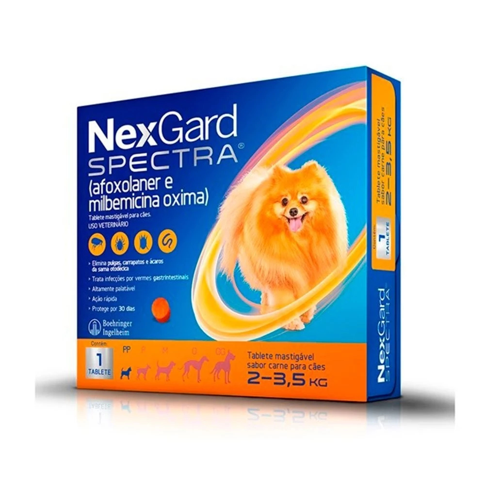 Antipulgas e Carrapatos NexGard Spectra Cães NexGard Spectra tem um rápido início de ação e atinge 100% de eficácia em 8 horas para pulgas. Pode ser administrado em cães adultos e filhotes acima de 2kg e a partir de oito semanas de vida.Referência no tratamento contra parasitas externos e internos, NexGard Spectra é o tablete mastigável comprovadamente seguro para cães de qualquer raça e conta com uma linha completa para atender diferentes portes e pesos.Os tabletes NexGard Spectra foram pensados para evitar a dificuldade usual na administração de remédios a animais, apresentando sabor agradável que os cães adoram.Para manter seu pet livre de pulgas, carrapatos, sarna e vermes, administre NexGard Spectra mensalmente, uma solução completa, é um e pronto!