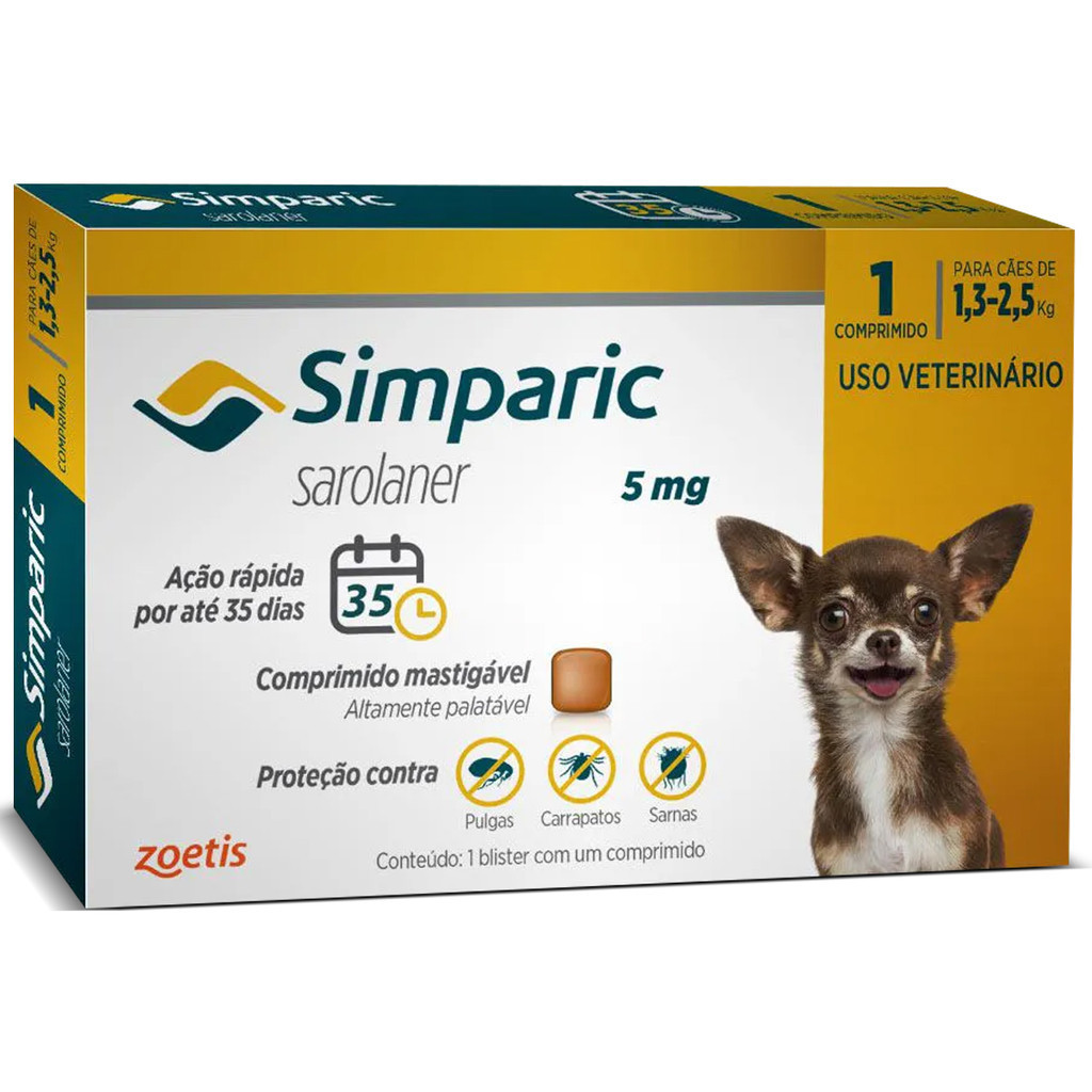 Antipulgas e Carrapatos Simparic 5mg para Cães de 1,3 a 2,5kg – 1 Comprimido – Zoetis