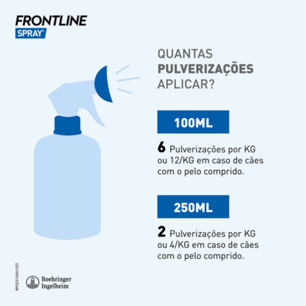 A MANADA ANIMAL é um marketplace de produtos veterinários. É a escolha certa para tutores que prezam pela qualidade dos produtos que seu animal necessita. Tudo com o suporte de uma equipe de veterinários e gestores com mais de 10 anos de experiência no mercado. Fique tranquilo, todos os nossos produtos são originais, adquiridos através de distribuidores credenciados! Ah, e todas as vendas acompanham nota fiscal! MANADA ANIMAL, Tranquilidade pra você, cuidado para ele! _______________________________________ Informações Gerais Solução tópica para cães e gatos Efeito knock-down, mata pulgas rapidamente após contato Controla rapidamente as reinfestações por novos parasitas Pode ser aplicado desde o 2º dia de vida Proteção por 30 dias Disponível em frascos de 100mL e 250mL Como FRONTLINE® Spray mata as pulgas e carrapatos? Ao ser aplicada, a solução se distribui pela pele e pelos do animal e mata pulgas rapidamente após contato e controla rapidamente as reinfestações por novos parasitas, podendo ser aplicado desde o 2º dia de vida e protegendo por 30 dias. Após utilizar FRONTLINE® Spray, eu continuo vendo pulgas em minha casa. Porquê? As pulgas que você vê, quase em sua maioria provém de ovos de pulgas que são depositados no ambiente antes mesmo de você iniciar o tratamento com FRONTLINE® Spray. Esses ovos podem levar muito tempo para eclodirem, portanto, aplicações mensais frequentes de FRONTLINE® Spray ajudam a eliminar o ciclo de vida das pulgas no ambiente. doméstico.