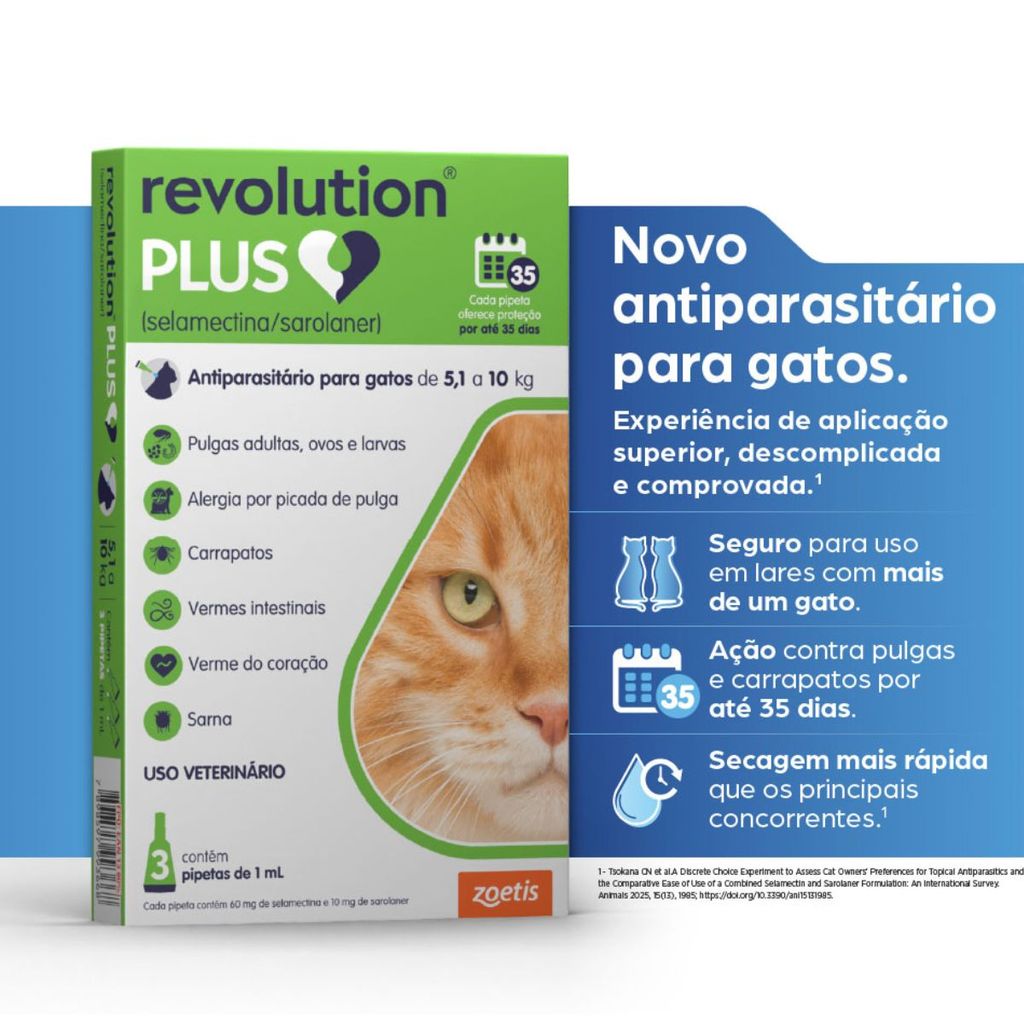 Descrição: Revolution Plus para Gatos de 5,1 kg a 10 kg A Revolution Plus é um novo antiparasitário para gatos, proporcionando uma experiência de aplicação superior, descomplicada e comprovada. É a proteção 6 em 1 que cuida de todo o corpo do seu gato, garantindo segurança, praticidade e eficácia. Fabricado pela Zoetis, referência mundial em saúde animal, este antiparasitário tópico mensal oferece proteção completa contra parasitas internos e externos, essencial até para gatos que ficam dentro de casa. Sua atividade ovicída e larvicida interrompe o ciclo de vida da pulga, podendo auxiliar no controle de infestações ambientais nas áreas às quais o animal tem acesso, garantindo proteção imediata e persistente por até 5 semanas contra novas infestações. Diferenciais de Revolution Plus Único produto indicado contra carrapatos em gatos; Proteção 6 em 1: combate pulgas (ovos e larvas), carrapatos, ácaros de orelha, 2 vermes intestinais e verme do coração; Ação rápida: começa a agir contra pulgas em até 6 horas; Secagem rápida: 4 horas; Proteção prolongada: até 35 dias (a caixa com 3 pipetas garante 105 dias de proteção); Prático e seguro: pipeta de fácil aplicação, odor suave, sem necessidade de separar os gatos; Indicado para gatos a partir de 8 semanas de idade e até 10 kg; Protege gatos indoor de parasitas que entram em casa por roupas, sapatos, janelas ou outros animais. Fórmula Cada 1 ml do produto contém: Selamectina .............................. 60 mg Sarolaner .................................. 10 mg Excipientes q.s.p ........................ 1,0 ml Indicações Revolution Plus é recomendado para uso em gatos a partir de 8 semanas de idade, para: Tratamento, controle e prevenção de infestações de pulgas (Ctenocephalides felis); Controle da dermatite alérgica por picada de pulgas (DAPP); Tratamento, controle e prevenção de infestações de carrapatos (Rhipicephalus sanguineus); Tratamento e controle da sarna de orelha (Otodectes cynotis); Tratamento e controle de vermes intestinais (Toxocara cati e Ancylostoma tubaeforme). Contraindicações Não usar em gatos doentes, debilitados ou abaixo do peso; Não utilizar em casos de hipersensibilidade às substâncias ativas ou a algum dos excipientes; A segurança em gatos com menos de 8 semanas, prenhes, lactantes ou destinados à reprodução não foi determinada. Modo de usar Separe o pelo na parte de trás do animal, na base do pescoço, até que a pele fique visível; Coloque a ponta da pipeta sobre a pele e aperte o tubo 3 ou 4 vezes para esvaziar todo o conteúdo em um único ponto; Mantendo a pipeta apertada, arraste-a para longe do líquido e levante para remover; Verifique se a pipeta está vazia; Aplicar uma vez a cada 35 dias. Benefícios Começa a agir em 6 horas contra pulgas; Proteção completa 6 em 1; Prático e seguro, sem necessidade de separar os gatos; Secagem rápida em 4 horas; Proteção até 35 dias por pipeta; Novo antiparasitário para gatos, com experiência de aplicação superior, descomplicada e comprovada.