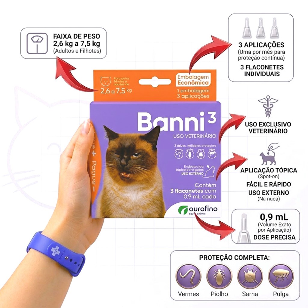 Vermifugo Antipulgas Para Gatos Banni C/ 3 Flaconetes Embalagem economica com 3 Flaconetes O Antipulgas Ourofino Banni 3 para Gatos de 2,6 a 7,5 Kg possui 2 tratamentos em uma única pipeta: parasitas externos e internos. Atua em infestações por pulgas (Ctenocephalides felis), vermes gastrointestinais redondos e chatos (Toxocara spp, Ancylostoma spp, Dipylidium caninum), ácaros causadores da Sarna Otodéctica (Otodectes cynotis) e piolhos (Felicola subrostratus). Atua na prevenção da DAPE (doença alérgica a picada de ectoparasitas, como a pulga). Protege seu gatinho por 49 dias. Pode ser utilizado em filhotes a partir de 30 dias de vida. Banni 3 não é repelente, o controle desses parasitas no ambiente onde os gatos vivem é importante para prevenir infestações. Deve ser aplicado exclusivamente de forma tópica, com 100% de eficácia contra a sarna de ouvido. Para gatos acima de 7,5kg deve ser administrada combinação de flaconetes para obtenção da dose certa, conforme o peso do animal.