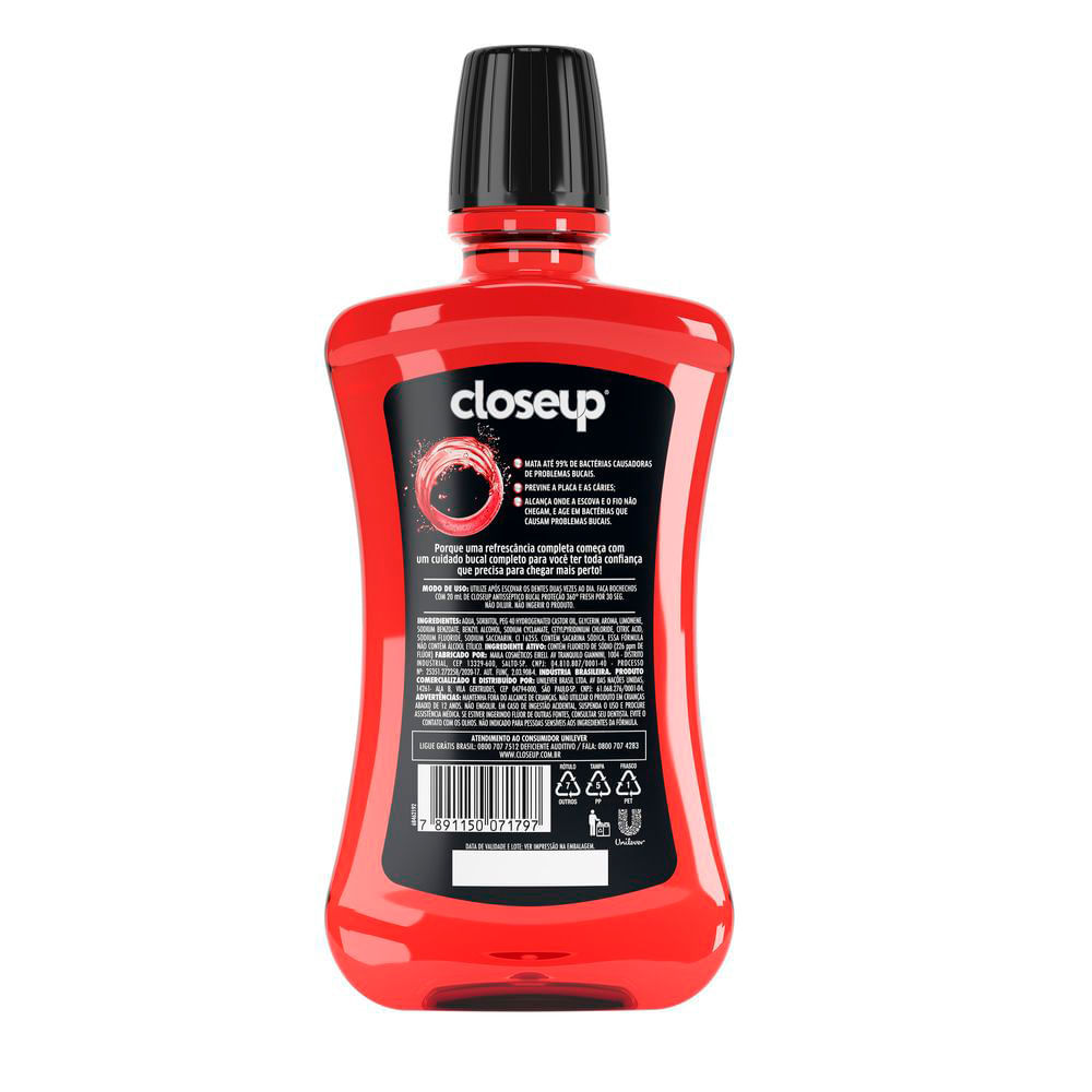 Mata até 99% dos germes que causam placa, gengivite e mau hálito. Previne a placa e as cáries Sinta seu hálito fresco por até 8h Alcança onde a escova e o fio dental não chegam, e age em bactérias que causam problemas bucais. Refrescância completa com cuidado bucal completo Nessa embalagem leve 500ml e pague 350ml Conheça o novo Antisséptico bucal Closeup Proteção 360º Fresh. Graças à sua fórmula exclusiva, mata até 99% dos germes e bactérias que causam placa, gengivite e mau hálito, prevenindo a placa e as cáries. Alcança onde a escova e o fio dental não chegam, agindo em bactérias que causam problemas bucais. Sinta seu hálito fresco por até 8h com o uso de Closeup Proteção 360º Fresh. Porque uma refrescância completa começa com um cuidado bucal completo para você ter toda confiança que precisa para chegar mais perto! O sabor Red Hot apresenta notas picantes de cravo combinadas com notas de menta específicas, proporcionando uma sensação de frescor. Modo de usar: após a escovação e uso de fio dental, pela manhã e à noite, faça bochechos com 20ml de Closeup Proteção 360º Fresh durante 30 segundos. Não diluir. Não ingerir o produto. Nesta versão econômica, leve 500ml e pague 350ml. Experimente também as outras versões dos Antissépticos Closeup 360º fresh: Ice sem álcool 500ml eIce com álcool 500ml. Use diariamente a linha completa de Closeup géis, cremes dentais, escovas de dentes e antissépticos bucais para ter um cuidado bucal completo, além de garantir proteção contra as cáries e o mau hálito."