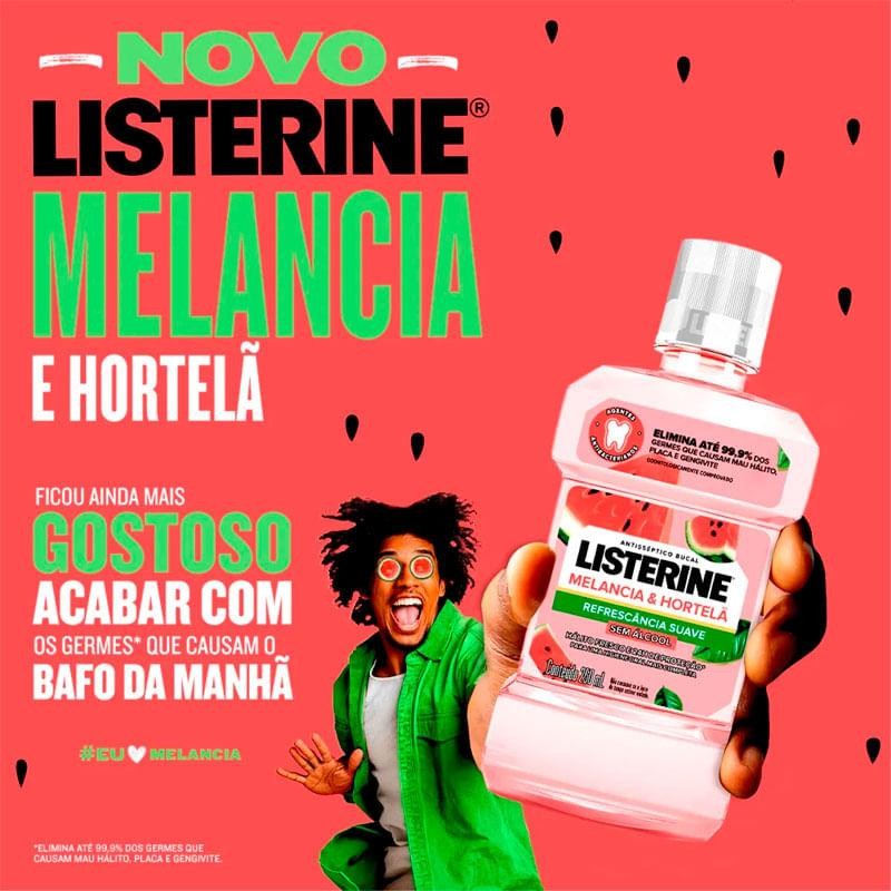Antisséptico Bucal Refrescância Suave Sem Álcool Sabor Melancia e Hortelã - Listerine O Antisséptico Bucal Listerine Melancia & Hortelã, uma solução suave e sem álcool que elimina até 99,9% dos germes causadores de mau hálito, placa e gengivite. Com sabor refrescante de melancia e hortelã, proporciona hálito fresco por 24 horas e uma higienização bucal completa. Ideal para quem busca proteção eficaz com suavidade. Benefícios: - Elimina 99,9% dos germes: Ajuda a combater as bactérias causadoras de mau hálito, placas bacterianas e gengivite. - Sem álcool: Fórmula suave, perfeita para quem tem sensibilidade. - Sabor único de melancia e hortelã: Refrescância suave que agrada a todos. - Proteção prolongada: Garante hálito fresco por até 24 horas com uso regular. - Fácil de usar: Ideal para complementar a sua rotina de higiene bucal. Diferenciais: - Indicado por dentistas. - Fórmula dermatologicamente e odontologicamente testada. - Embalagem 100% reciclável, contribuindo para o cuidado com o meio ambiente. Modo de Uso: 1. Após escovar os dentes, encha a tampa medidora com o antisséptico até a marca indicada (aproximadamente 20ml). 2. Faça bochechos por 30 segundos, sem engolir. 3. Use duas vezes ao dia para uma proteção completa. Perguntas frequentes 1. O produto contém álcool? Não. Este produto é formulado sem álcool, proporcionando uma experiência mais suave. 2. Pode ser usado por crianças? Sim, crianças acima de 6 anos podem usar, desde que supervisionadas por um adulto para evitar a ingestão. 3. Posso engolir o produto? Não. O antisséptico bucal deve ser cuspido após o uso. 4. Onde posso comprar? Pode ser encontrado em s, supermercados e lojas online. Na , você encontra uma seleção exclusiva de produtos para Higiene Oral, com as melhores marcas e os lançamentos mais recentes! Tudo isso com preços imbatíveis e a conveniência de receber em casa com conforto, praticidade e total segurança. Não perca!