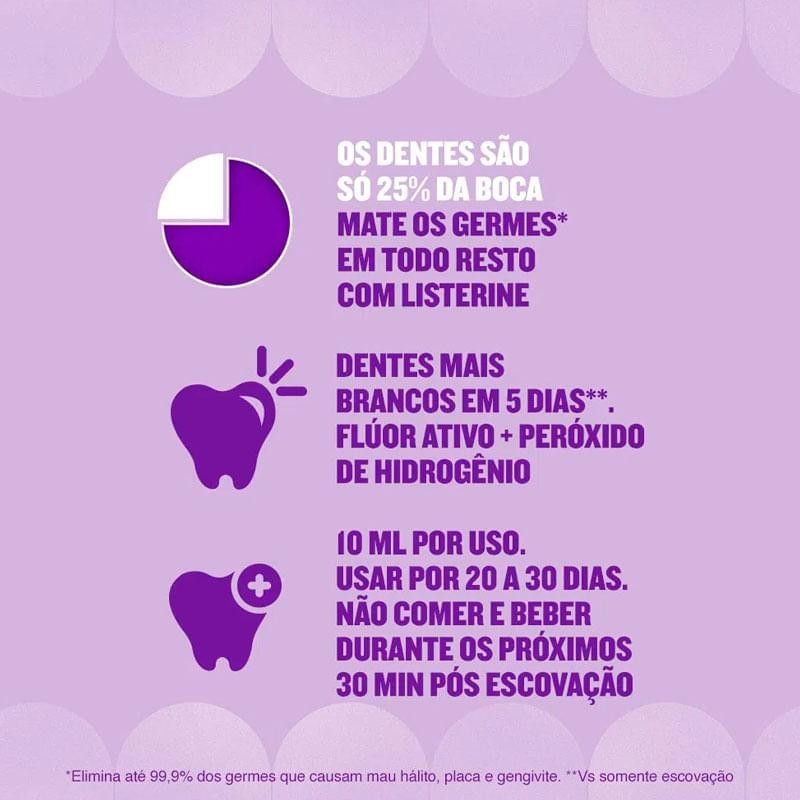 O Listerine Whitening é um branqueador em formato de enxaguante bucal, que branqueia os dentes e mata os germes que causam o mau hálito. Sua fórmula de efeito espumante e dinâmico permite que você sinta a ação branqueadora. Possui bolhas ativas que atuam eliminando as manchas e branqueando os dentes.
