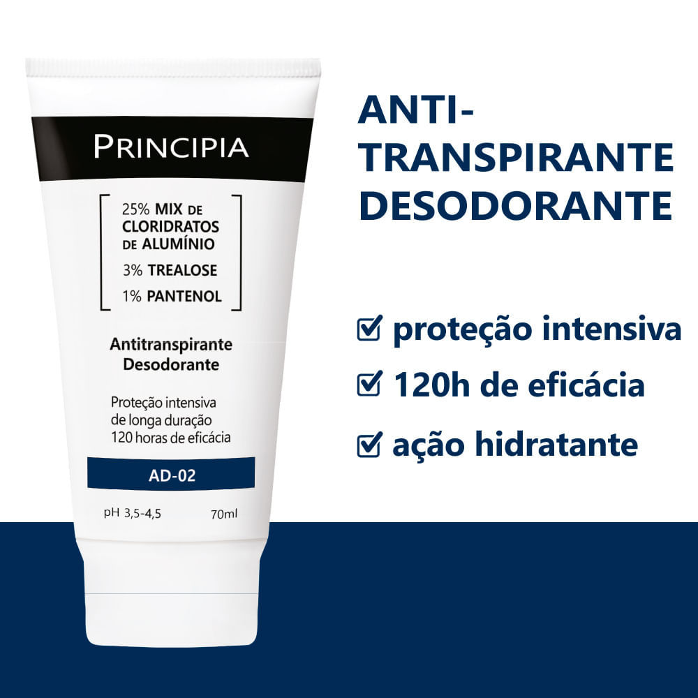 Antitranspirante Desodorante Principia AD-02 Antitranspirante Desodorante com 25% de Mix de Cloridratos de Alumínio, 3% de Trealose e 1% de Pantenol com proteção intensiva, 120 horas de eficácia e açã