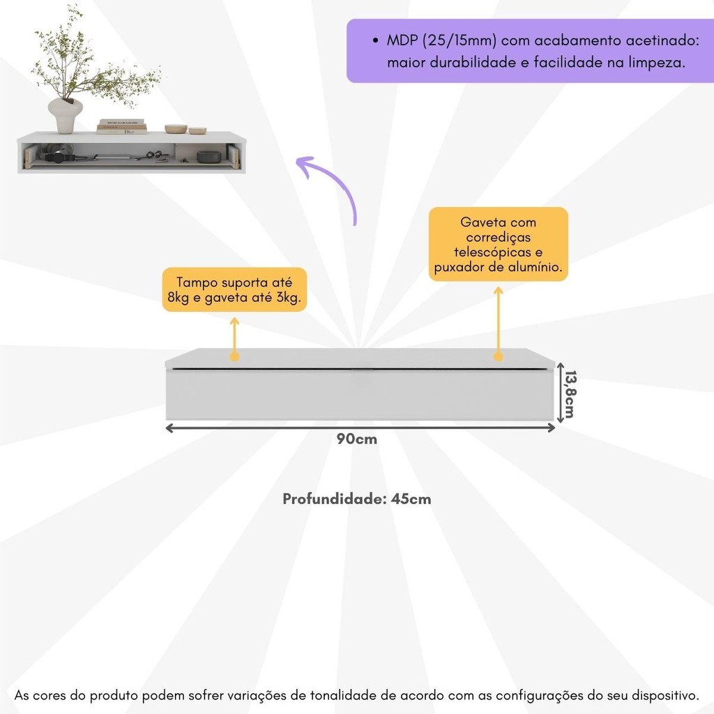 Transforme seu ambiente com um móvel que une elegância e praticidade. Produzido em MDP de 15mm com pintura UV, o Aparador 90cm Suspenso com 1 Gaveta Multimóveis CR50100 garante durabilidade e resistência em cada detalhe. A gaveta espaçosa, suportando até 3kg, é perfeita para armazenar seus itens essenciais com segurança. Experimente a suavidade das corrediças telescópicas, que proporcionam um manuseio silencioso e sem esforço. O puxador em alumínio escovado destaca-se pelo design minimalista, oferecendo um toque moderno a qualquer sala, enquanto o tampo suporta até 8kg, ideal para exibir suas decorações preferidas. Com montagem suspensa, este aparador é uma peça-chave que redefine o conceito de sofisticação em seu lar. Conteúdo da Embalagem: 1 (um) Aparador Manual de Montagem Kit Ferragem Dimensões do produto montado: Altura: 13,8cm | Largura: 90cm | Profundidade: 45cm *Você pode consultar as medidas detalhadas na imagem técnica do produto. *As cores do produto podem sofrer variações de tonalidade de acordo com as configurações do seu dispositivo. Imagem meramente ilustrativa. Decoração e eletros não acompanham o produto. O produto será entregue desmontado e não disponibilizamos o serviço de montagem.