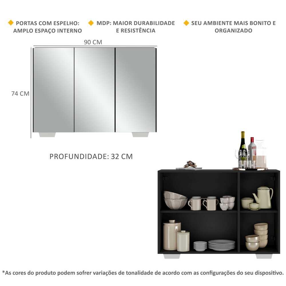 O Aparador Buffet 3 Portas com Espelho e Pés Quadrados Vegas Multimóveis é produzido em MDP, que garante maior durabilidade, além de um acabamento superior. Com 3 portas, possui acabamento acetinado (cerca de 20% de brilho) e um excelente espaço interno para organizar seus pertences (as prateleiras internas suportam 2 e 5 Kg cada e o tampo 7 Kg). Os pés quadrados, em polipropileno, facilitam na hora da limpeza. Os detalhes com espelhos nas portas deixam o móvel mais requintado, criando um ambiente moderno e charmoso. Os espelhos são de vidro (o que evita que a imagem fique distorcida) e lapidados, ou seja, passam por um processo para que as bordas não fiquem cortantes, o que garante maior segurança. Seu design minimalista, torna o móvel muito versátil, podendo ser utilizado de diversas maneiras e em qualquer ambiente. Conteúdo da Embalagem: 1 (um) aparador 1 (um) kit com 4 pés quadrados 1 (um) kit com 3 espelhos Dimensões do produto montado: Altura: 74cm | Largura: 90cm | Profundidade: 32cm *Você pode consultar as medidas internas na imagem técnica do produto. Cores Disponíveis: Branco - Branco/Natural - Branco/Preto - Preto - Preto/Natural - Preto/Branco *As cores do produto podem sofrer variações de tonalidade de acordo com as configurações do seu dispositivo. *Obrigatório fixar na parede. Imagem meramente ilustrativa. Decoração e eletros não acompanham o produto. O produto será entregue desmontado e não disponibilizamos o serviço de montagem.