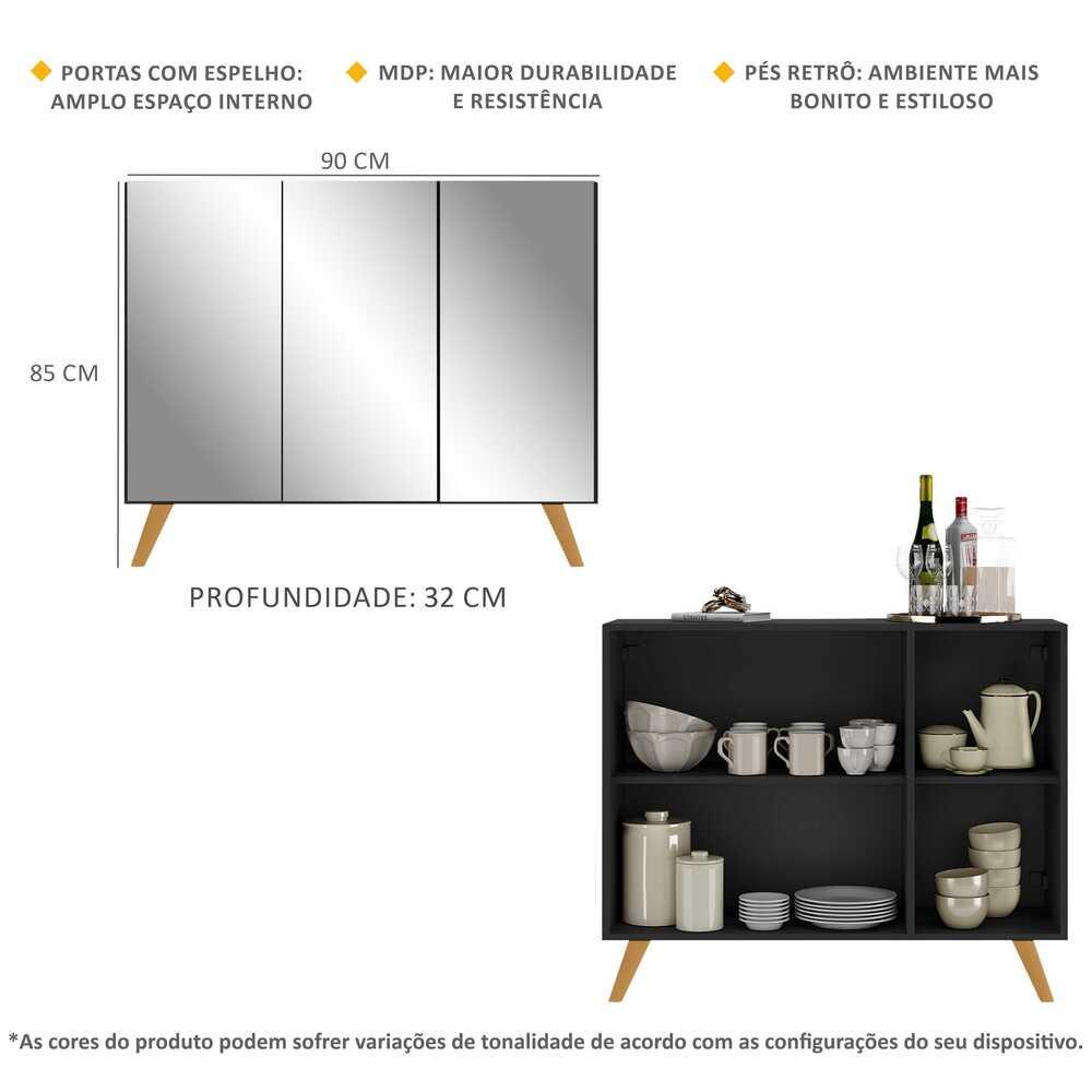 O Aparador Buffet 3 Portas com Espelho Retrô Vegas Multimóveis é produzido em MDP, que garante maior durabilidade, facilidade na limpeza, além de um acabamento superior. Com 3 portas, possui acabamento acetinado (cerca de 20% de brilho) e um excelente espaço interno para organizar seus pertences (as prateleiras internas suportam 2 e 5 Kg cada e o tampo 7 Kg). Os pés retrô, em polipropileno, e os detalhes com espelhos nas portas dão um charme especial ao móvel deixando-o com um visual leve e permitindo você compor um ambiente com ar vintage e moderno ao mesmo tempo. Os espelhos são de vidro (o que evita que a imagem fique distorcida) e lapidados, ou seja, passam por um processo para que as bordas não fiquem cortantes, o que garante maior segurança. Seu design minimalista, torna o móvel muito versátil, podendo ser utilizado de diversas maneiras e em qualquer ambiente. Conteúdo da Embalagem: 1 (um) aparador 1 (um) kit com 4 pés retrô 1 (um) kit com 3 espelhos Dimensões do produto montado: Altura: 85cm | Largura: 90cm | Profundidade: 32cm *Você pode consultar as medidas internas na imagem técnica do produto. Cores Disponíveis: Branco - Branco/Natural - Branco/Preto - Preto - Preto/Natural - Preto/Branco *As cores do produto podem sofrer variações de tonalidade de acordo com as configurações do seu dispositivo. *Obrigatório fixar na parede. Imagem meramente ilustrativa. Decoração e eletros não acompanham o produto. O produto será entregue desmontado e não disponibilizamos o serviço de montagem.