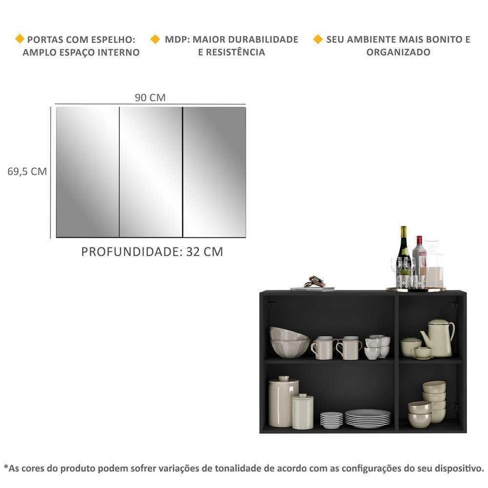 O Aparador Buffet 3 Portas com Espelho Vegas Multimóveis é produzido em MDP, que garante maior durabilidade, facilidade na limpeza, além de um acabamento superior. Com 3 portas, possui acabamento acetinado (cerca de 20% de brilho) e um excelente espaço interno para organizar seus pertences (as prateleiras internas suportam 2 e 5 Kg cada e o tampo 7 Kg). Os detalhes com espelhos nas portas deixam o móvel mais requintado, criando um ambiente moderno e charmoso. Os espelhos são de vidro (o que evita que a imagem fique distorcida) e lapidados, ou seja, passam por um processo para que as bordas não fiquem cortantes, o que garante maior segurança. Seu design minimalista, torna o móvel muito versátil, podendo ser utilizado de diversas maneiras e em qualquer ambiente. Conteúdo da Embalagem: 1 (um) aparador 1 (um) kit com 3 espelhos Dimensões do produto montado: Altura: 69,5cm | Largura: 90cm | Profundidade: 32cm *Você pode consultar as medidas internas na imagem técnica do produto. Cores Disponíveis: Branco - Preto *As cores do produto podem sofrer variações de tonalidade de acordo com as configurações do seu dispositivo. *Obrigatório fixar na parede. Imagem meramente ilustrativa. Decoração e eletros não acompanham o produto. O produto será entregue desmontado e não disponibilizamos o serviço de montagem.