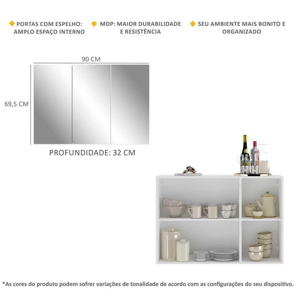 O Aparador Buffet 3 Portas com Espelho Vegas Multimóveis é produzido em MDP, que garante maior durabilidade, facilidade na limpeza, além de um acabamento superior. Com 3 portas, possui acabamento acetinado (cerca de 20% de brilho) e um excelente espaço interno para organizar seus pertences (as prateleiras internas suportam 2 e 5 Kg cada e o tampo 7 Kg). Os detalhes com espelhos nas portas deixam o móvel mais requintado, criando um ambiente moderno e charmoso. Os espelhos são de vidro (o que evita que a imagem fique distorcida) e lapidados, ou seja, passam por um processo para que as bordas não fiquem cortantes, o que garante maior segurança. Seu design minimalista, torna o móvel muito versátil, podendo ser utilizado de diversas maneiras e em qualquer ambiente. Conteúdo da Embalagem: 1 (um) aparador 1 (um) kit com 3 espelhos Dimensões do produto montado: Altura: 69,5cm | Largura: 90cm | Profundidade: 32cm *Você pode consultar as medidas internas na imagem técnica do produto. *As cores do produto podem sofrer variações de tonalidade de acordo com as configurações do seu dispositivo. *Obrigatório fixar na parede. Imagem meramente ilustrativa. Decoração e eletros não acompanham o produto. O produto será entregue desmontado e não disponibilizamos o serviço de montagem.