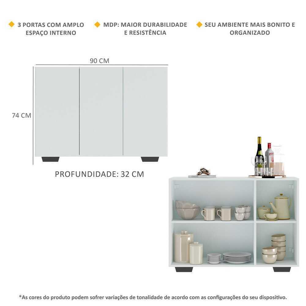 O Aparador Buffet 3 Portas com Pés Quadrados Veneza Multimóveis é produzido em MDP com acabamento acetinado (cerca de 20% de brilho), que garante maior durabilidade, além de um acabamento superior. Com 3 portas, possui um excelente espaço interno para organizar seus pertences (as prateleiras internas suportam 2 e 5 Kg cada e o tampo 7 Kg). Os pés quadrados, em polipropileno, facilitam na hora da limpeza. Seu design minimalista, torna o móvel muito versátil, podendo ser utilizado de diversas maneiras e em qualquer ambiente. Conteúdo da Embalagem: 1 (um) aparador 1 (um) kit com 4 pés quadrados Dimensões do produto montado: Altura: 74cm | Largura: 90cm | Profundidade: 32cm *Você pode consultar as medidas internas na imagem técnica do produto. Cores Disponíveis: Branco - Branco/Natural - Branco/Preto - Preto - Preto/Natural - Preto/Branco *As cores do produto podem sofrer variações de tonalidade de acordo com as configurações do seu dispositivo. *Obrigatório fixar na parede. Imagem meramente ilustrativa. Decoração e eletros não acompanham o produto. O produto será entregue desmontado e não disponibilizamos o serviço de montagem.