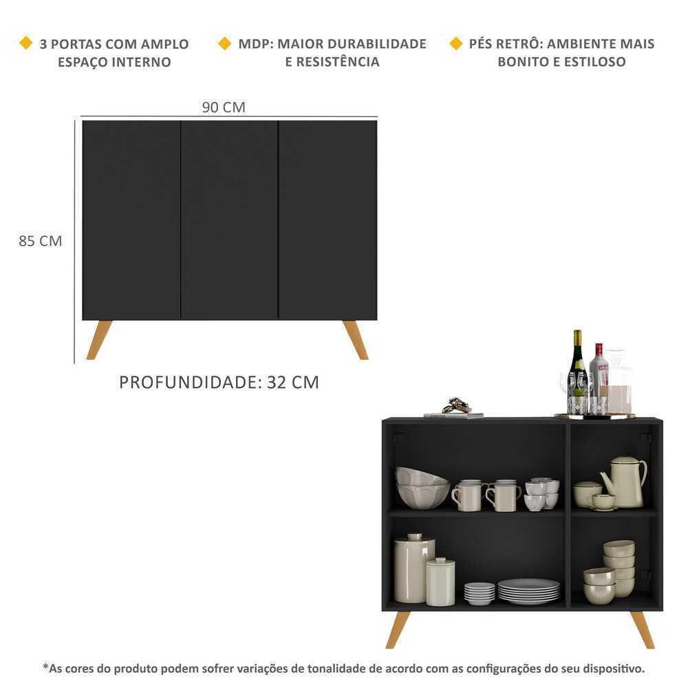 Aparador Buffet 3 Portas Retrô Veneza Multimóveis MP1009 Preto/Natural