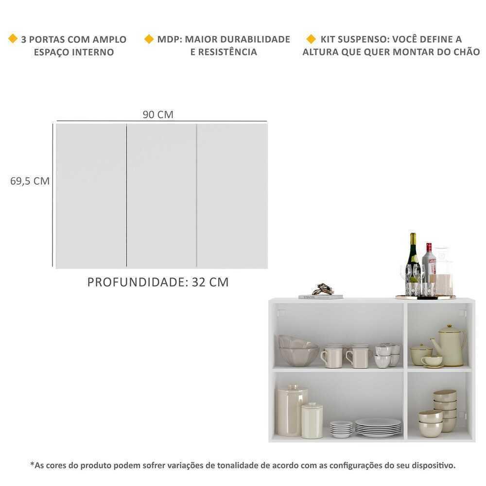 O Aparador Buffet 3 Portas Suspenso Veneza Multimóveis é produzido em MDP com acabamento acetinado (cerca de 20% de brilho), que garante maior durabilidade, facilidade na limpeza, além de um acabamento superior. Com 3 portas, possui um excelente espaço interno para organizar seus pertences (as prateleiras internas suportam 2 e 5 Kg cada e o tampo 7 Kg) e ainda acompanha kit para ser montado de forma suspensa, conforme a altura que você quiser do chão. Seu design minimalista, torna o móvel muito versátil, podendo ser utilizado de diversas maneiras e em qualquer ambiente. Conteúdo da Embalagem: 1 (um) aparador 1 (um) kit com suporte para aparador Dimensões do produto montado: Altura: 69,5cm | Largura: 90cm | Profundidade: 32cm *Você pode consultar as medidas internas na imagem técnica do produto. Cores Disponíveis: Branco - Preto *As cores do produto podem sofrer variações de tonalidade de acordo com as configurações do seu dispositivo. *Obrigatório fixar na parede. Imagem meramente ilustrativa. Decoração e eletros não acompanham o produto. O produto será entregue desmontado e não disponibilizamos o serviço de montagem.