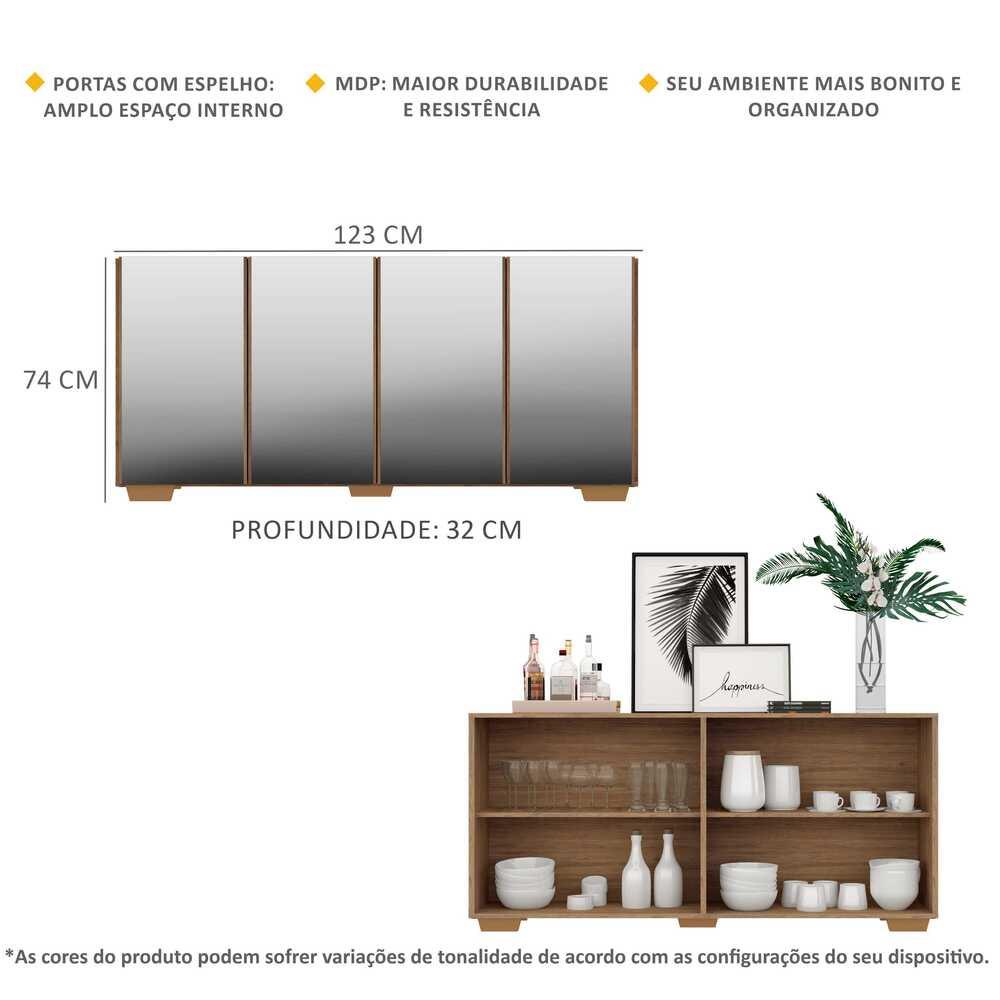 O Aparador Buffet 4 portas com Espelho e Pés Quadrados Vegas é produzido em MDP, que garante maior durabilidade, além de um acabamento superior. Com 4 portas, possui acabamento acetinado (cerca de 20% de brilho) e um excelente espaço interno para organizar seus pertences (as prateleiras internas suportam 5 Kg cada e o tampo 10 Kg). Os pés quadrados, em polipropileno, facilitam na hora da limpeza. Os detalhes com espelhos nas portas deixam o móvel mais requintado, criando um ambiente moderno e charmoso. Os espelhos são de vidro (o que evita que a imagem fique distorcida) e lapidados, ou seja, passam por um processo para que as bordas não fiquem cortantes, o que garante maior segurança. Seu design minimalista, torna o móvel muito versátil, podendo ser utilizado de diversas maneiras e em qualquer ambiente. Conteúdo da Embalagem: 1 (um) aparador 1 (um) kit com 5 pés quadrados 1 (um) kit com 4 espelhos Dimensões do produto montado: Altura: 74cm | Largura: 123cm | Profundidade: 32cm *Você pode consultar as medidas internas na imagem técnica do produto. *As cores do produto podem sofrer variações de tonalidade de acordo com as configurações do seu dispositivo. *Obrigatório fixar na parede. Imagem meramente ilustrativa. Decoração e eletros não acompanham o produto. O produto será entregue desmontado e não disponibilizamos o serviço de montagem.