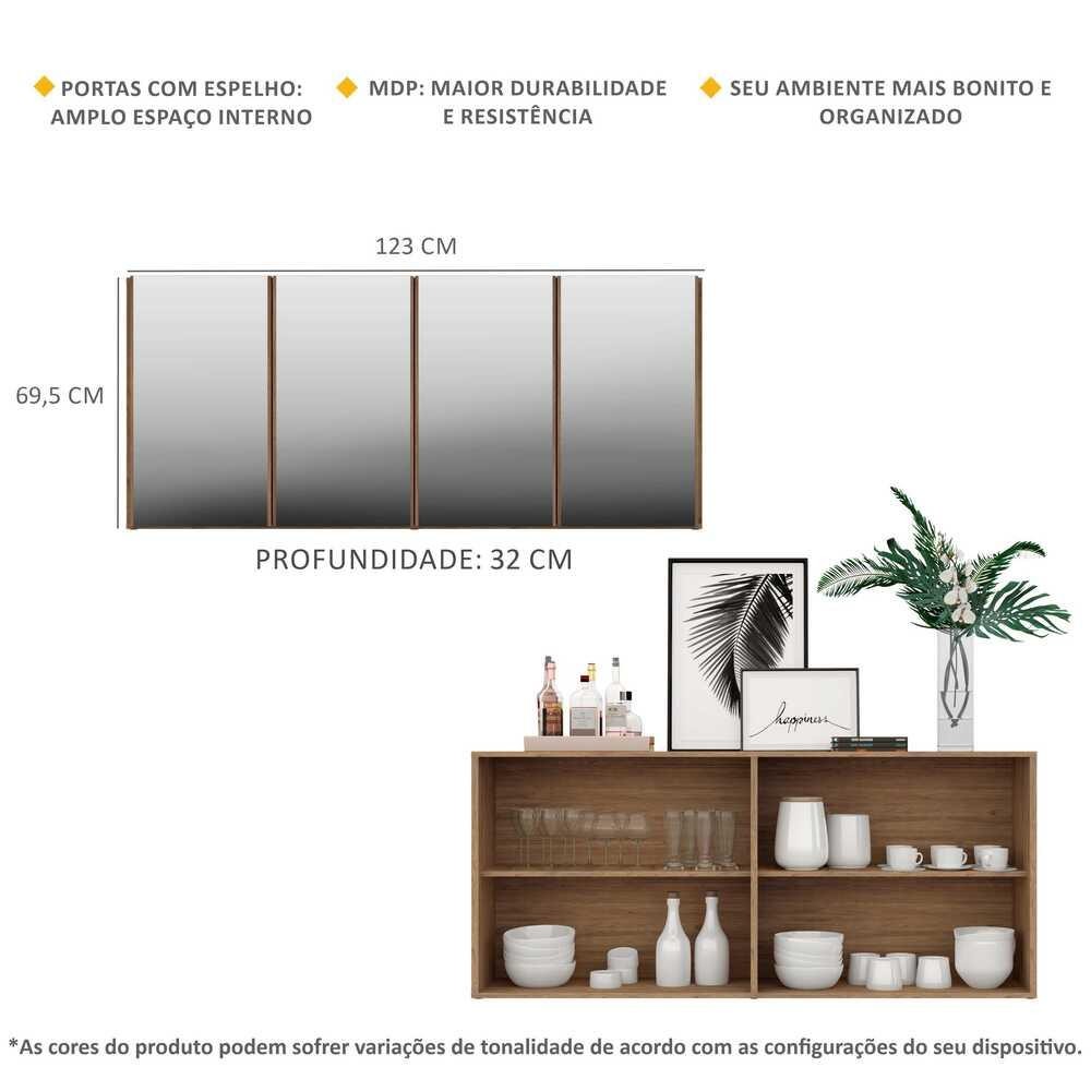 O Aparador Buffet 4 Portas com Espelho Vegas Multimóveis é produzido em MDP, que garante maior durabilidade, facilidade na limpeza, além de um acabamento superior. Com 4 portas, possui acabamento acetinado (cerca de 20% de brilho) e um excelente espaço interno para organizar seus pertences (as prateleiras internas suportam 5 Kg cada e o tampo 10 Kg). Os detalhes com espelhos nas portas deixam o móvel mais requintado, criando um ambiente moderno e charmoso. Os espelhos são de vidro (o que evita que a imagem fique distorcida) e lapidados, ou seja, passam por um processo para que as bordas não fiquem cortantes, o que garante maior segurança. Seu design minimalista, torna o móvel muito versátil, podendo ser utilizado de diversas maneiras e em qualquer ambiente. Conteúdo da Embalagem: 1 (um) aparador 1 (um) kit com 4 espelhos Dimensões do produto montado: Altura: 69,5cm | Largura: 123cm | Profundidade: 32cm *Você pode consultar as medidas internas na imagem técnica do produto. *As cores do produto podem sofrer variações de tonalidade de acordo com as configurações do seu dispositivo. *Obrigatório fixar na parede. Imagem meramente ilustrativa. Decoração e eletros não acompanham o produto. O produto será entregue desmontado e não disponibilizamos o serviço de montagem.