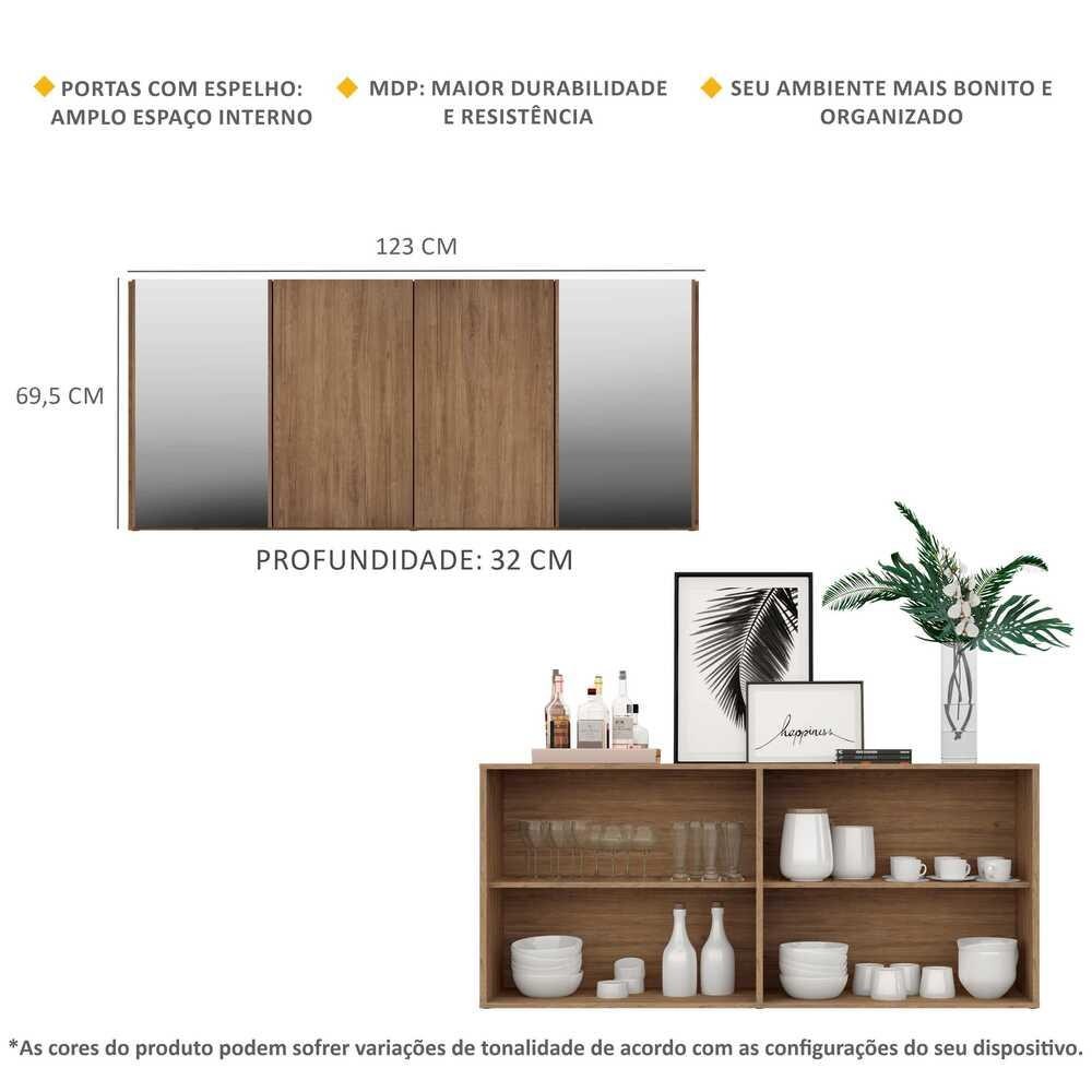 O Aparador Buffet com Espelho Vegas Multimóveis é produzido em MDP, que garante maior durabilidade, facilidade na limpeza, além de um acabamento superior. Com 4 portas, possui acabamento acetinado (cerca de 20% de brilho) e um excelente espaço interno para organizar seus pertences (as prateleiras internas suportam 5 Kg cada e o tampo 10 Kg). Os detalhes com espelhos nas portas deixam o móvel mais requintado, criando um ambiente moderno e charmoso. Os espelhos são de vidro (o que evita que a imagem fique distorcida) e lapidados, ou seja, passam por um processo para que as bordas não fiquem cortantes, o que garante maior segurança. Seu design minimalista, torna o móvel muito versátil, podendo ser utilizado de diversas maneiras e em qualquer ambiente. Conteúdo da Embalagem: 1 (um) aparador 1 (um) kit com 2 espelhos Dimensões do produto montado: Altura: 69,5cm | Largura: 123cm | Profundidade: 32cm *Você pode consultar as medidas internas na imagem técnica do produto. *As cores do produto podem sofrer variações de tonalidade de acordo com as configurações do seu dispositivo. *Obrigatório fixar na parede. Imagem meramente ilustrativa. Decoração e eletros não acompanham o produto. O produto será entregue desmontado e não disponibilizamos o serviço de montagem.
