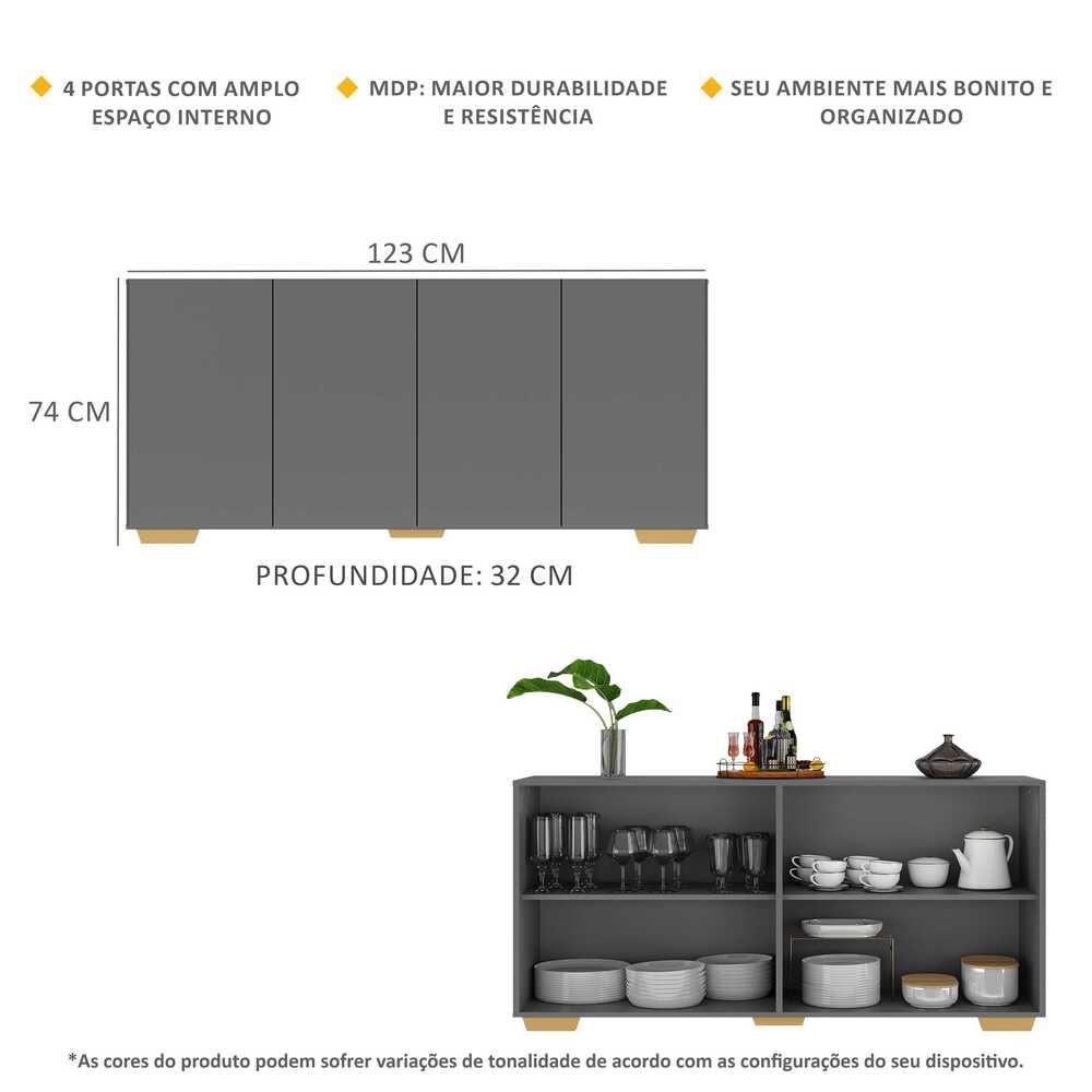 O Aparador Buffet 4 portas com Pés Quadrados Veneza Multimóveis é produzido em MDP com acabamento acetinado (cerca de 20% de brilho), que garante maior durabilidade, além de um acabamento superior. Com 4 portas, possui um excelente espaço interno para organizar seus pertences (as prateleiras internas suportam 5 Kg cada e o tampo 10 Kg). Os pés quadrados, em polipropileno, facilitam na hora da limpeza. Seu design minimalista, torna o móvel muito versátil, podendo ser utilizado de diversas maneiras e em qualquer ambiente. Conteúdo da Embalagem: 1 (um) aparador 1 (um) kit com 5 pés quadrados Dimensões do produto montado: Altura: 74cm | Largura: 123cm | Profundidade: 32cm *Você pode consultar as medidas internas na imagem técnica do produto. *As cores do produto podem sofrer variações de tonalidade de acordo com as configurações do seu dispositivo. *Obrigatório fixar na parede. Imagem meramente ilustrativa. Decoração e eletros não acompanham o produto. O produto será entregue desmontado e não disponibilizamos o serviço de montagem.