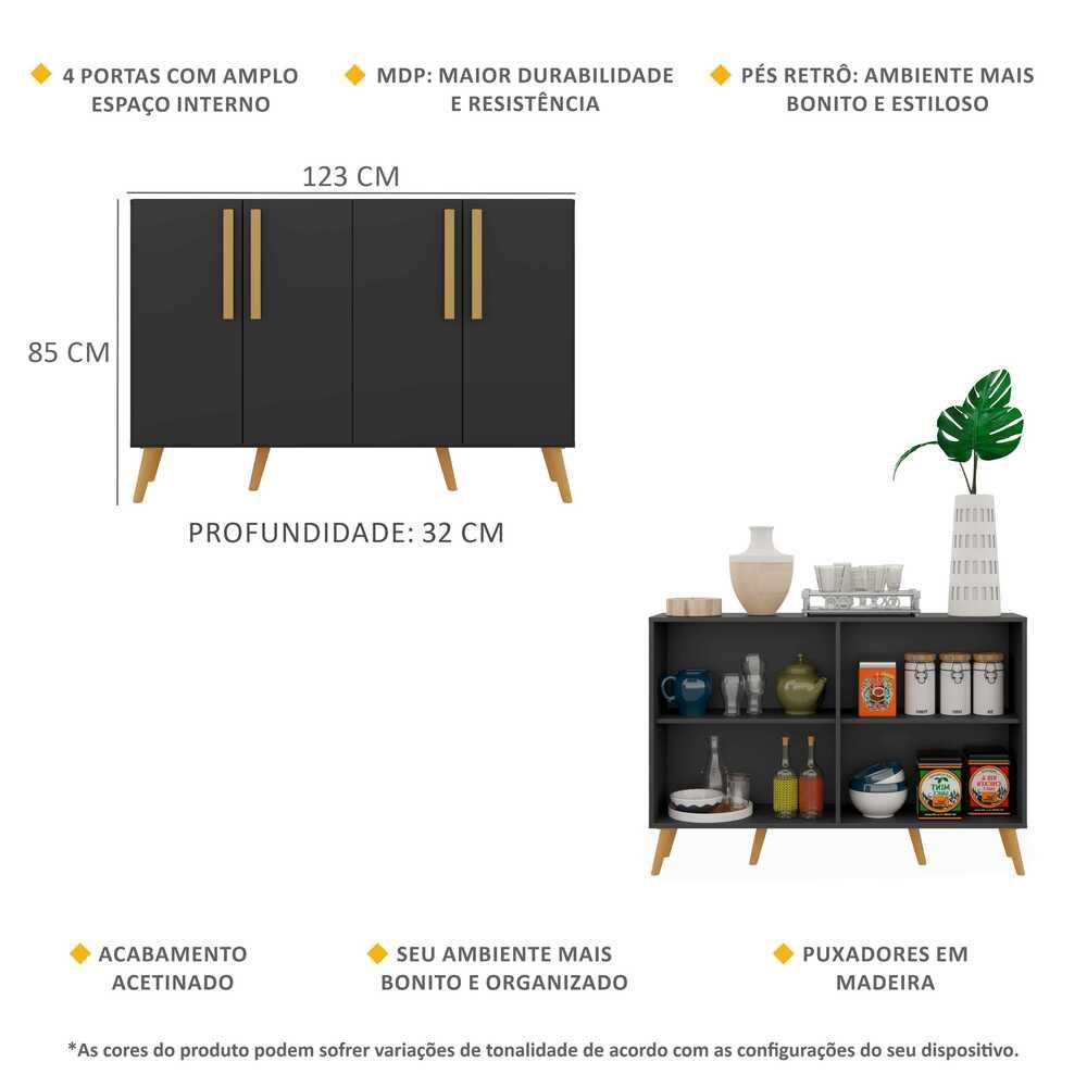 Aparador Buffet 4 Portas com Pés Retrô Viena Multimóveis Preto/Natural