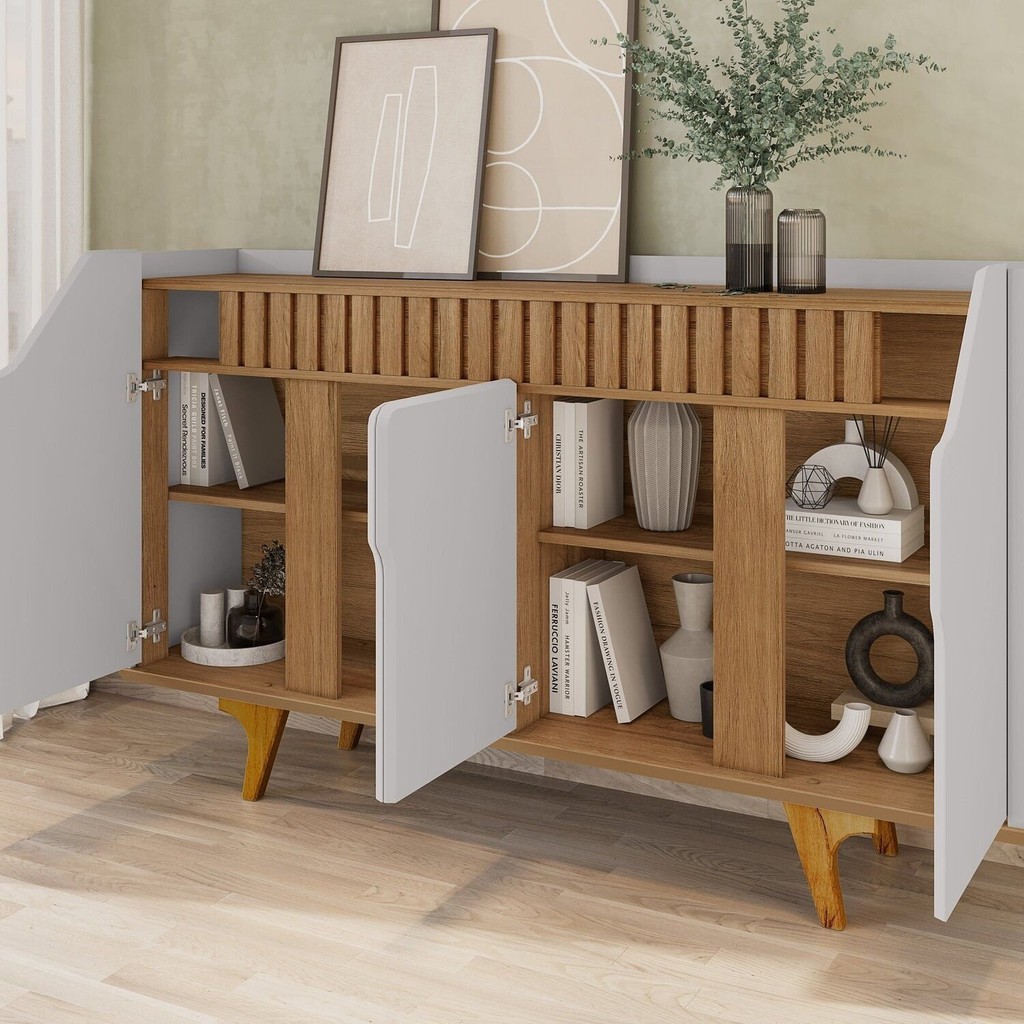 Aparador Buffet 4 Portas Mdf Ripado Real Pés de Madeira Maciça Tâmisa
