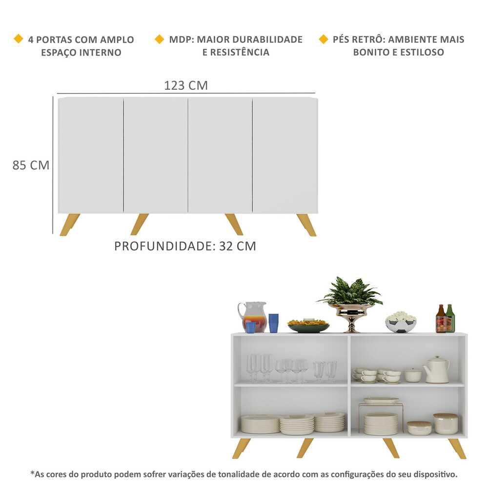 O Aparador Buffet 4 Portas Retrô Alemanha Multimóveis é produzido em MDP com acabamento acetinado (cerca de 20% de brilho), que garante maior durabilidade, facilidade na limpeza, além de um acabamento superior. Com 4 portas, possui um excelente espaço interno para organizar seus pertences (as prateleiras internas suportam 5 Kg cada e o tampo 10 Kg). Os pés retrô, em polipropileno, dão um charme especial ao móvel deixando-o com um visual leve e permitindo você compor um ambiente com ar vintage e moderno ao mesmo tempo. Seu design minimalista, torna o móvel muito versátil, podendo ser utilizado de diversas maneiras e em qualquer ambiente. Conteúdo da Embalagem: 1 (um) aparador 1 (um) kit com 6 pés retrô Dimensões do produto montado: Altura: 85cm | Largura: 123cm | Profundidade: 32cm *Você pode consultar as medidas internas na imagem técnica do produto. *As cores do produto podem sofrer variações de tonalidade de acordo com as configurações do seu dispositivo. *Obrigatório fixar na parede. Imagem meramente ilustrativa. Decoração e eletros não acompanham o produto. O produto será entregue desmontado e não disponibilizamos o serviço de montagem.