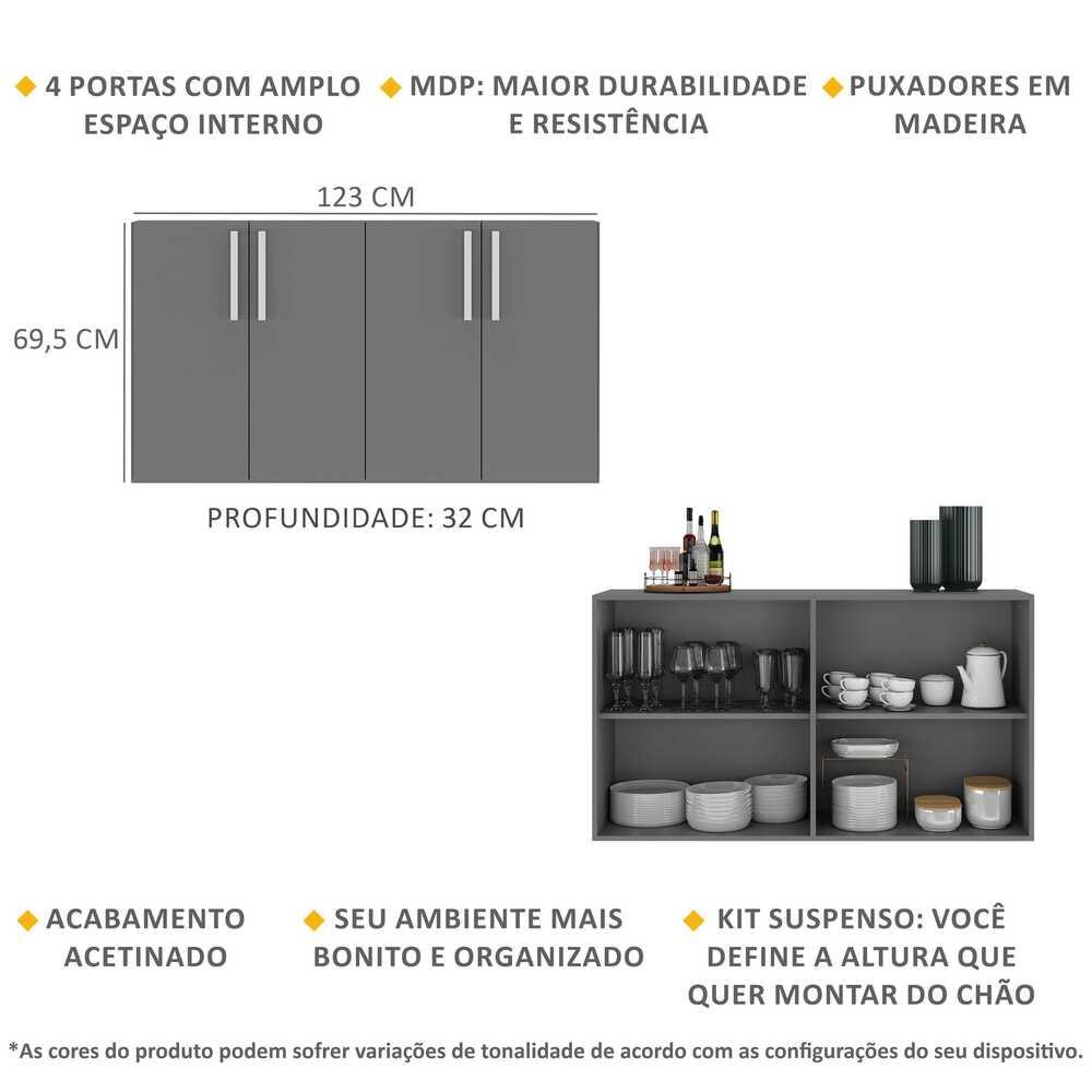 O Aparador Buffet 4 Portas Suspenso Viena Multimóveis é produzido em MDP com acabamento acetinado (cerca de 20% de brilho), que garante maior durabilidade, facilidade na limpeza, além de um acabamento superior. Com 4 portas e puxadores em madeira, possui um excelente espaço interno para organizar seus pertences (as prateleiras internas suportam 5 Kg cada e o tampo 10 Kg) e ainda acompanha kit para ser montado de forma suspensa, conforme a altura que você quiser do chão. Seu design minimalista, torna o móvel muito versátil, podendo ser utilizado de diversas maneiras e em qualquer ambiente. Conteúdo da Embalagem: 1 (um) aparador 1 (um) kit com 4 puxadores 1 (um) kit com suporte para aparador Dimensões do produto montado: Altura: 69,5cm | Largura: 123cm | Profundidade: 32cm *Você pode consultar as medidas internas na imagem técnica do produto. *As cores do produto podem sofrer variações de tonalidade de acordo com as configurações do seu dispositivo. *Obrigatório fixar na parede. Imagem meramente ilustrativa. Decoração e eletros não acompanham o produto. O produto será entregue desmontado e não disponibilizamos o serviço de montagem.
