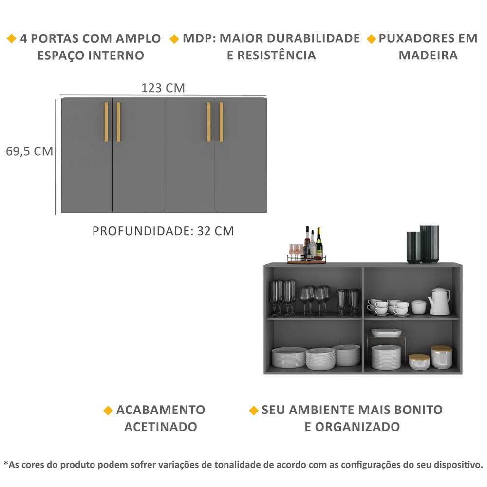 O Aparador Buffet 4 portas Viena Multimóveis é produzido em MDP com acabamento acetinado (cerca de 20% de brilho), que garante maior durabilidade, facilidade na limpeza, além de um acabamento superior. Com 4 portas e puxadores em madeira, possui um excelente espaço interno para organizar seus pertences (as prateleiras internas suportam 5 Kg cada e o tampo 10 Kg). Seu design minimalista, torna o móvel muito versátil, podendo ser utilizado de diversas maneiras e em qualquer ambiente. Conteúdo da Embalagem: 1 (um) aparador 1 (um) kit com 4 puxadores Dimensões do produto montado: Altura: 69,5cm | Largura: 123cm | Profundidade: 32cm *Você pode consultar as medidas internas na imagem técnica do produto. *As cores do produto podem sofrer variações de tonalidade de acordo com as configurações do seu dispositivo. *Obrigatório fixar na parede. Imagem meramente ilustrativa. Decoração e eletros não acompanham o produto. O produto será entregue desmontado e não disponibilizamos o serviço de montagem.