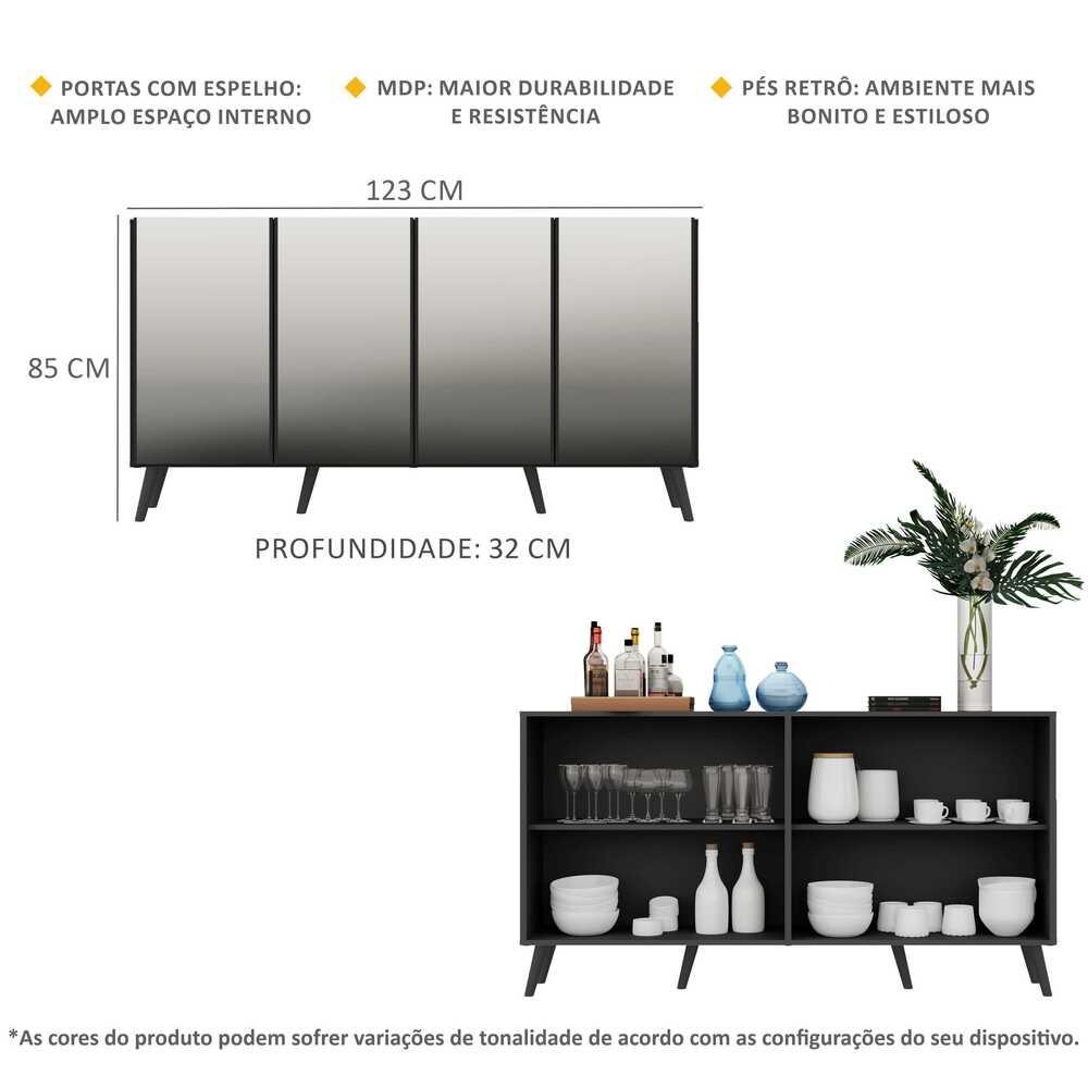 Aparador Buffet 4 Ptas c/ Espelho e Pés Retrô Vegas Multimóveis Preto