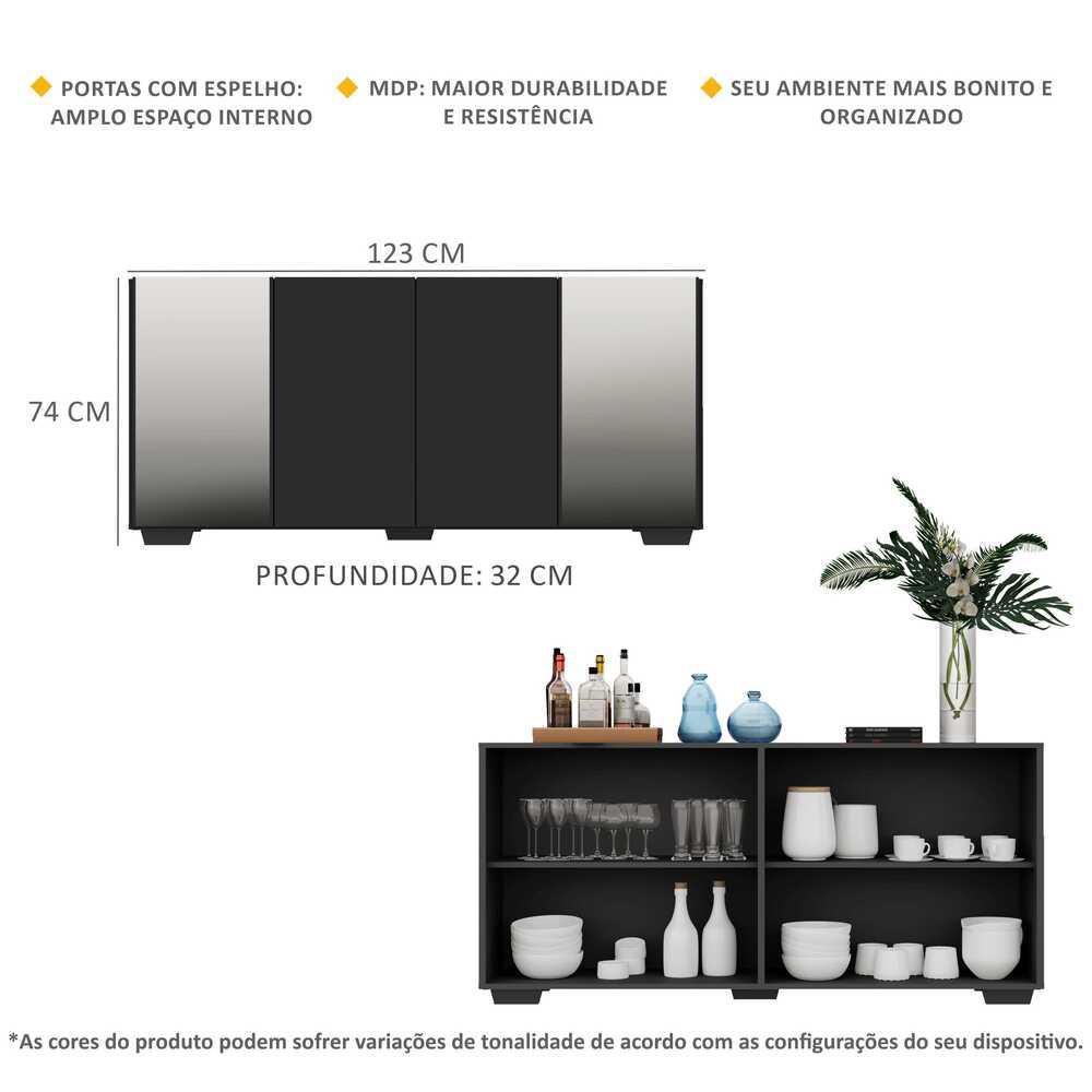 O Aparador Buffet com Espelho e Pés Quadrados Vegas Multimóveis é produzido em MDP, que garante maior durabilidade, além de um acabamento superior. Com 4 portas, possui acabamento acetinado (cerca de 20% de brilho) e um excelente espaço interno para organizar seus pertences (as prateleiras internas suportam 5 Kg cada e o tampo 10 Kg). Os pés quadrados, em polipropileno, facilitam na hora da limpeza. Os detalhes com espelhos nas portas deixam o móvel mais requintado, criando um ambiente moderno e charmoso. Os espelhos são de vidro (o que evita que a imagem fique distorcida) e lapidados, ou seja, passam por um processo para que as bordas não fiquem cortantes, o que garante maior segurança. Seu design minimalista, torna o móvel muito versátil, podendo ser utilizado de diversas maneiras e em qualquer ambiente. Conteúdo da Embalagem: 1 (um) aparador 1 (um) kit com 5 pés quadrados 1 (um) kit com 2 espelhos Dimensões do produto montado: Altura: 74cm | Largura: 123cm | Profundidade: 32cm *Você pode consultar as medidas internas na imagem técnica do produto. *As cores do produto podem sofrer variações de tonalidade de acordo com as configurações do seu dispositivo. *Obrigatório fixar na parede. Imagem meramente ilustrativa. Decoração e eletros não acompanham o produto. O produto será entregue desmontado e não disponibilizamos o serviço de montagem.