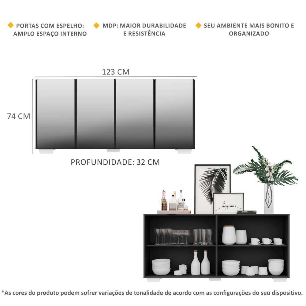O Aparador Buffet 4 portas com Espelho e Pés Quadrados Vegas é produzido em MDP, que garante maior durabilidade, além de um acabamento superior. Com 4 portas, possui acabamento acetinado (cerca de 20% de brilho) e um excelente espaço interno para organizar seus pertences (as prateleiras internas suportam 5 Kg cada e o tampo 10 Kg). Os pés quadrados, em polipropileno, facilitam na hora da limpeza. Os detalhes com espelhos nas portas deixam o móvel mais requintado, criando um ambiente moderno e charmoso. Os espelhos são de vidro (o que evita que a imagem fique distorcida) e lapidados, ou seja, passam por um processo para que as bordas não fiquem cortantes, o que garante maior segurança. Seu design minimalista, torna o móvel muito versátil, podendo ser utilizado de diversas maneiras e em qualquer ambiente. Conteúdo da Embalagem: 1 (um) aparador 1 (um) kit com 5 pés quadrados 1 (um) kit com 4 espelhos Dimensões do produto montado: Altura: 74cm | Largura: 123cm | Profundidade: 32cm *Você pode consultar as medidas internas na imagem técnica do produto. *As cores do produto podem sofrer variações de tonalidade de acordo com as configurações do seu dispositivo. *Obrigatório fixar na parede. Imagem meramente ilustrativa. Decoração e eletros não acompanham o produto. O produto será entregue desmontado e não disponibilizamos o serviço de montagem.