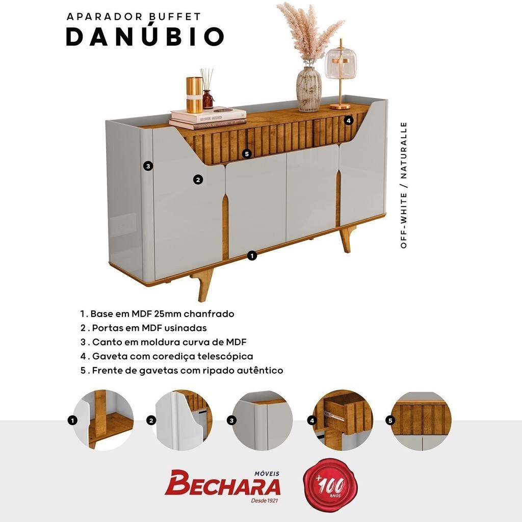 O Aparador Danúbio é o móvel que sua casa precisa! Ele possui design moderno que mescla suas curvas nas portas e laterais com detalhe em ripado real. Ele conta com Base em MDF de 25mm chanfrada em ângulo, portas em MDF chanfrada com design único que proporciona ao produto beleza charme e requinte como nenhum outro entrega! Cantos curvos feitos em MDF, amplo tampo e prateleira ajustável. Gavetas com corrediças telescópicas, sendo as frentes em ripado real. Pés em madeira maciça que garantem ainda mais resistência e qualidade ao produto. Estilo: Moderno Bandeja: Não Formato: Retangular Peso (kg): 55.58 Garantia: 03 Meses Altura (cm): 93 Acabamento: Pintura UV Largura (cm): 180 Possui Pés: Sim Possui Adega: Não Possui Vidro: Não Possui Portas: Sim Tipo de Porta: Bater Altura dos Pés: 17 Pés Reguláveis: Não Possui Gavetas: Sim Possui Rodízio: Não Suporta Até (kg): 49 Possui Espelhos: Não Profundidade (cm): 38 Escala de Brilho: Brilhante Gaveta com Chave: Não Material dos Pés: Madeira Maciça Material da Porta: MDF Material do Tampo: MDP Origem do Produto: Nacional Acabamento dos Pés: Verniz Ambiente Principal: Sala de Jantar Material da Gaveta: MDF/MDP Material Principal: MDF/MDP Possui Prateleiras: Não Resistente à Chuva: Não Acabamento da Porta: Pintura UV Sapatas Niveladoras: Não Acabamento da Gaveta: Pintura Texturizada UV Peso Máximo por Gaveta: 5 Tipo de Puxador da Porta: Embutido Escala de Brilho da Porta: Brilhante Tipo de Puxador da Gaveta: Externo Escala de Brilho da Gaveta: Semi-Brilho Tipo de Corrediça da Gaveta: Metálica Telescópica Material do Puxador da Gaveta: MDF Informações Complementares (Novo): Elaborado em MDF de 25mm e 15mm 12mm, MDP 15mm. Corrediças Telescópica, pés de madeira maciça e Dobradiças com Sistema SoftClose Tipo de Dobradiça/Corrediça da Porta: Metálica Marca: Móveis Bechara Cor Flex: Não Cor Interna: Off-White Cor: Off White/Naturalle Cor do Produto: Off-White/Naturalle Itens Inclusos: 01 - Aparador Buffet Danúbio ; 01 - Manual de Montagem Detalhado Cor Predominante: Branco Linha ou Coleção: Danúbio Quantidade de Gavetas: 02 Gavetas