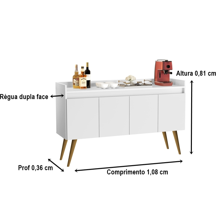Aparador Buffet 2, 3 e 4 Portas Luxo estilo retrô, pés palito, embalado com caixa reforçada nas laterais para não ocorrer avaria no transporte. DIMENSÕES DO PRODUTO MONTADO APARADOR 2 PORTAS Altura: 0,81 cm Largura: 0,81 cm Profundidade: 0,36 cm DIMENSÕES DO PRODUTO MONTADO APARADOR 3 PORTAS Altura: 0,81 cm Largura: 0,90 cm Profundidade: 0,36 cm DIMENSÕES DO PRODUTO MONTADO APARADOR 4 PORTAS Altura: 0,81 cm Largura: 1,08 cm Profundidade: 0,36 cm CARACTERISTICAS: Pés palito em madeira maciça Portas com dobradiças metálica Material: MDP/MDF MONTAGEM: Este produto acompanha kit de montagem + manual de instrução detalhando passo a passo de como montar. A montagem do produto deverá ser feita por um profissional, para que não ocorram danos no produto.