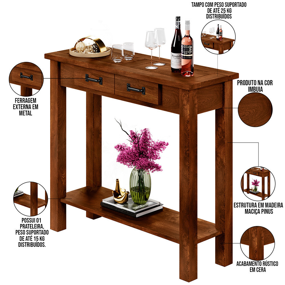 Ter um móvel com um toque rústico em casa faz toda a diferença, por isso o Aparador Buffet Sala De Estar 01 Gaveta 100cm W02 New Rústico Madeira Maciça Imbuia - Lyam Decor traz todos os detalhes muito característicos deste estilo para tornar qualquer espaço único. Ideal para compor área de lazer, espaço gourmet ou até mesmo para evidenciar ainda mais o natural na sua decoração dentro de casa. Possui uma gaveta que o torna ainda mais funcional para uso diário e armazenamento de objetos, além de trazer um ar incrivelmente convidativo e charmoso. Adquira já o seu! Dimensões (A x L x P) 84,5 x 100 x 33 cm Características: Estrutura em madeira maciça de Pinus, cor Imbuia. Ferragem externa em metal na cor Preto. Possui 01 gaveta com 02 puxadores em metal. Possui 01 prateleira. Pés de madeira 45x45. Acabamento rústico em cera. - Suporta até 25 kg em sua base superior, e 15 kg na prateleira inferior. - Manter ao abrigo de local interno, sem ficar exposto diretamente ao sol, calor e umidade excessiva. Dica de conservação: Não deixe acumular sujeira em seu móvel. Esta sujeira se acumula nos poros, fazendo sua cor escurecer, realize a limpeza deste produto apenas com pano seco. Não cortar alimentos sobre a cerâmica, a prática pode riscar o espaço decorativo. Observações importantes: - Produto para uso residencial em ambiente interno, não devendo ficar exposto diretamente ao sol, calor e umidade excessivos. - Pode haver alguma diferença de tonalidade entre a imagem e o produto real, por conta do tratamento de imagens e a calibração de cores do seu monitor. - As imagens são meramente ilustrativas, não acompanham objetos de decoração e eletrônicos. - Ao receber a mercadoria, o cliente deve verificar as condições da embalagem, caso haja alguma avaria não assine o comprovante de recebimento. - Montagem, desmontagem e outras instalações serão de responsabilidade do cliente. Não nos responsabilizamos, no ato da entrega, por subir escadas/elevadores ou pelo transporte por guincho em apartamentos. Eventuais despesas são de responsabilidade do comprador. - Confira as dimensões do produto e certifique-se de que passará normalmente por supostos elevadores, portas, escadas e/ou corredores de sua residência.