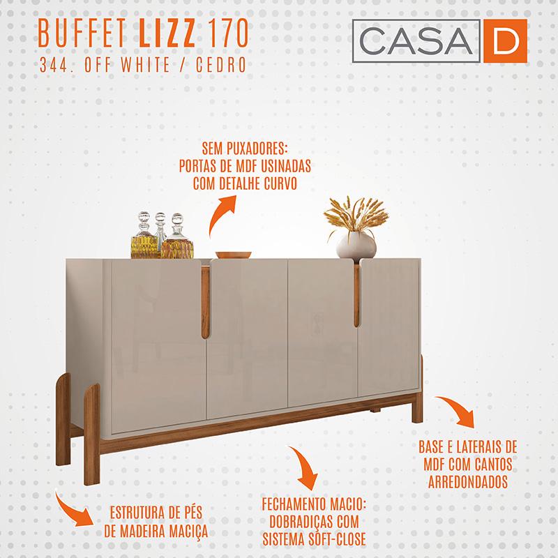 Marca: Casa D; Linha: Sala; Modelo: Buffet Lizz 170; Material da estrutura: MDP 15 mm, MDF 15 mm e 25 mm com pés de madeira maciça; Acabamento: Pintura Print Wood; Altura: 79 cm; Largura: 170 cm; Profundidade: 38,5 cm; Quantidade de portas: 04, com sistema Soft-Close (fechamento macio); Tipo de dobradiças: Metálicas (Soft-Close); Quantidade de gavetas: Não se aplica; Tipo de corrediças: Não se aplica; Com puxador: Sim, detalhe curvo; Material do puxador: Embutido; Quantidade prateleiras: 02; Peso suportado: 50 kg; Requer montagem: Sim (kit montagem incluso); Condição do item: Novo; É kit: Não; Altura da embalagem: 17,3 cm; Largura da embalagem: 41 cm; Comprimento da embalagem: 165,5 cm; Peso: 46,3 kg; Embalagem do envio: Papelão e plástico. Informações adicionais: - Os objetos que ambientam as fotos não acompanham o produto; - O produto será entregue desmontado; - É de inteira responsabilidade do cliente a montagem do produto e/ou instalação, custos de transporte por escadas e/ou elevadores, guincho ou içamento, assim como possíveis irregularidades provenientes de manuseio inadequado; - Embora o produto acompanhe o manual de montagem, verifique a complexidade antes de decidir montá-lo sozinho, recomendamos que contrate um profissional de sua confiança; - Fique atento, nossas cores podem sofrer alterações dependendo do seu monitor; - ANTES DE MONTAR O SEU PRODUTO, certifique-se que todas as instruções dispostas no manual, bem como todas as ferragens descritas, estejam presentes dentro da embalagem. Verifique se há alguma peça danificada, caso esteja, prestaremos a devida assistência dentro do prazo da garantia.